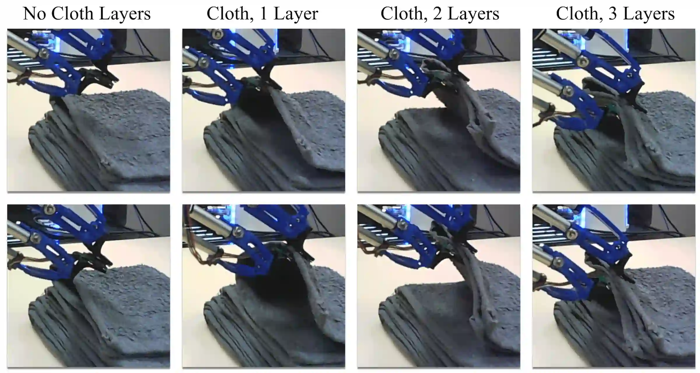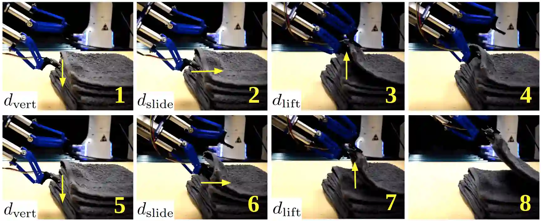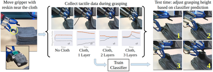 翻译:木布的机械操控具有从制造布料到处理毯子和洗衣等各种应用。 木布的操控对机器人具有挑战性, 主要是因为机器人在折叠或折叠的配置中拥有高度的自由、 复杂的动态和严格的自我隔离。 之前的布的机械操控工作主要依靠视觉传感器, 这可能会对细微的操控任务构成挑战, 例如从堆叠的布中获取所需数量的布层。 在本文中, 我们提议使用触摸感应进行布控操作; 我们将触摸感应器( Rekin) 附加在Franka机器人的两个指尖中, 并训练一个分类器, 以确定机器人是否掌握了特定的布层。 在测试时, 机器人将这一分类作为其政策的一部分, 用触摸反馈来掌握一两个布层, 以确定合适的抓取点。 实验结果超过 180 物理试验表明, 拟议的方法比不使用触摸回的基线, 并且比使用图像分析器/ httpsco, 数据、 视频和视频在使用图像分类/sglegleglegles/coms 。