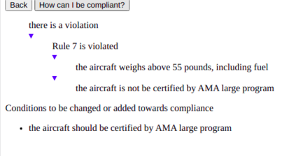 翻译:我们提出了一种新应用的“目标识别答案设置程序”,将示范飞机操作员的合规核查与模拟航空器学会安全守则进行数字化。AMA安全守则规范了AMA传单如何为有限的娱乐目的操作无人驾驶航空器(UAVs),飞行无人驾驶飞机及其操作员在飞机操作之前和之后遵守各种规则以确保安全飞行。在本文件中,我们利用“答案设定程序”来编码AMA安全守则和自动合规检查。为了检查遵守情况,我们使用以目标为导向的ASP引擎S(CASP)进行合规核查。通过S(CASP)操作者可以很容易地检查违规情况,并获得解释可人读自然语言中违规原因的理由树。此外,我们采用算法帮助操作员获得为通过合规检查而需要满足的最低限度条件。我们开发了一个前端问卷接口,接受各种条件,并使用后端SASP发动机来评估条件是否符合条例。我们还利用了ASPASPASPASP系统第一版的S-AVIS系统应用软件和SWI系统最佳应用能力,这是SWISA-ProRO-S-ProviS-SLA的S-Svial应用系统。我们S-S-S-S-S-S-S-S-SLisalvialvivivivivial的系统应用系统应用系统。