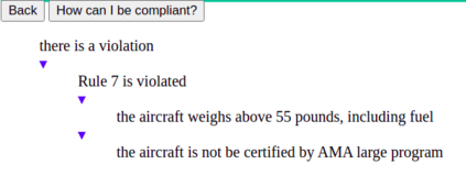 We present a novel application of Goal-Directed Answer Set Programming that digitizes the model aircraft operator's compliance verification against the Academy of Model Aircrafts (AMA) safety code. The AMA safety code regulates how AMA flyers operate Unmanned Aerial Vehicles (UAVs) for limited recreational purposes. Flying drones and their operators are subject to various rules before and after the operation of the aircraft to ensure safe flights. In this paper, we leverage Answer Set Programming to encode the AMA safety code and automate compliance checks. To check compliance, we use the s(CASP) which is a goal-directed ASP engine. By using s(CASP) the operators can easily check for violations and obtain a justification tree explaining the cause of the violations in human-readable natural language. Further, we implement an algorithm to help the operators obtain the minimal set of conditions that need to be satisfied in order to pass the compliance check. We develop a front-end questionnaire interface that accepts various conditions and use the backend s(CASP) engine to evaluate whether the conditions adhere to the regulations. We also leverage s(CASP) implemented in SWI-Prolog, where SWI-Prolog exposes the reasoning capabilities of s(CASP) as a REST service. To the best of our knowledge, this is the first application of ASP in the AMA and Avionics Compliance and Certification space.