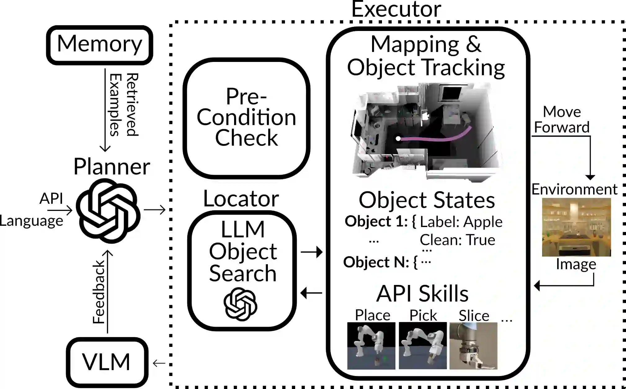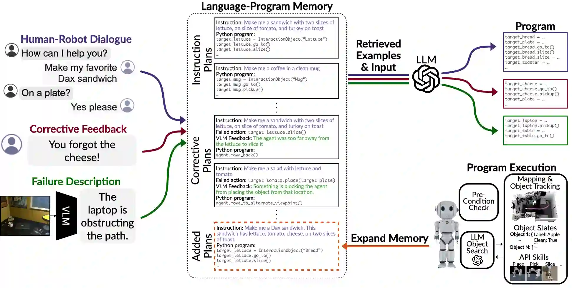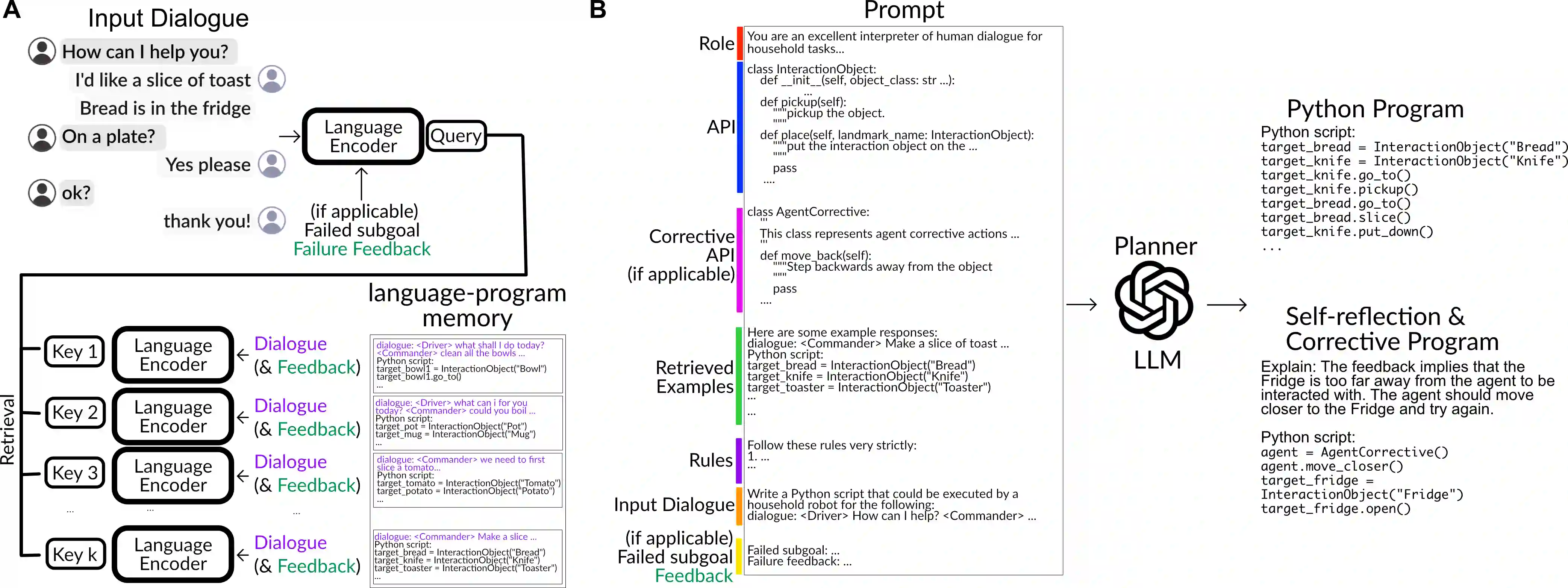 Pre-trained and frozen LLMs can effectively map simple scene re-arrangement instructions to programs over a robot's visuomotor functions through appropriate few-shot example prompting. To parse open-domain natural language and adapt to a user's idiosyncratic procedures, not known during prompt engineering time, fixed prompts fall short. In this paper, we introduce HELPER, an embodied agent equipped with an external memory of language-program pairs that parses free-form human-robot dialogue into action programs through retrieval-augmented LLM prompting: relevant memories are retrieved based on the current dialogue, instruction, correction or VLM description, and used as in-context prompt examples for LLM querying. The memory is expanded during deployment to include pairs of user's language and action plans, to assist future inferences and personalize them to the user's language and routines. HELPER sets a new state-of-the-art in the TEACh benchmark in both Execution from Dialog History (EDH) and Trajectory from Dialogue (TfD), with 1.7x improvement over the previous SOTA for TfD. Our models, code and video results can be found in our project's website: https://helper-agent-llm.github.io.