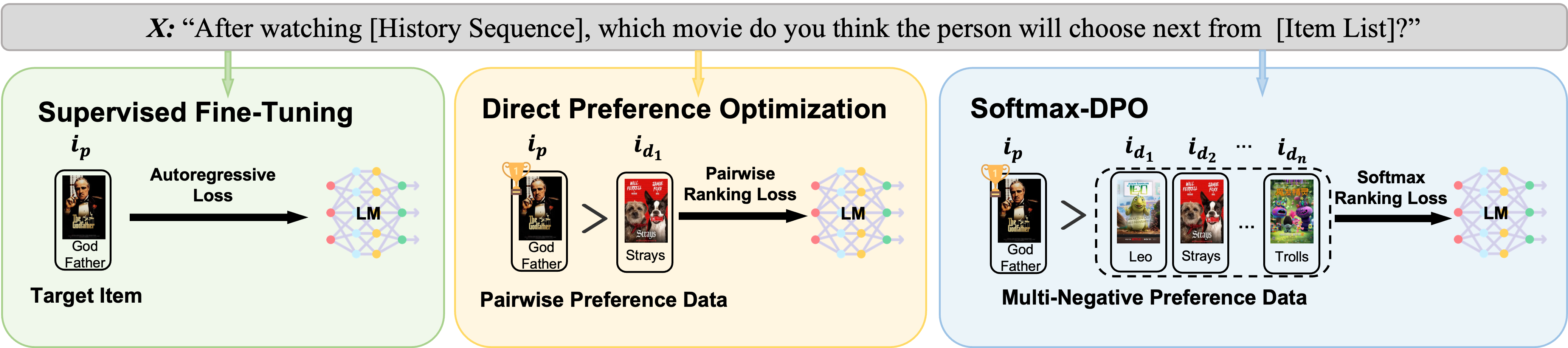 Recommender systems aim to predict personalized rankings based on user preference data. With the rise of Language Models (LMs), LM-based recommenders have been widely explored due to their extensive world knowledge and powerful reasoning abilities. Most of the LM-based recommenders convert historical interactions into language prompts, pairing with a positive item as the target response and fine-tuning LM with a language modeling loss. However, the current objective fails to fully leverage preference data and is not optimized for personalized ranking tasks, which hinders the performance of LM-based recommenders. Inspired by the current advancement of Direct Preference Optimization (DPO) in human preference alignment and the success of softmax loss in recommendations, we propose Softmax-DPO (S-DPO) to instill ranking information into the LM to help LM-based recommenders distinguish preferred items from negatives, rather than solely focusing on positives. Specifically, we incorporate multiple negatives in user preference data and devise an alternative version of DPO loss tailored for LM-based recommenders, which is extended from the traditional full-ranking Plackett-Luce (PL) model to partial rankings and connected to softmax sampling strategies. Theoretically, we bridge S-DPO with the softmax loss over negative sampling and find that it has an inherent benefit of mining hard negatives, which assures its exceptional capabilities in recommendation tasks. Empirically, extensive experiments conducted on three real-world datasets demonstrate the superiority of S-DPO to effectively model user preference and further boost recommendation performance while providing better rewards for preferred items. Our codes are available at https://github.com/chenyuxin1999/S-DPO.