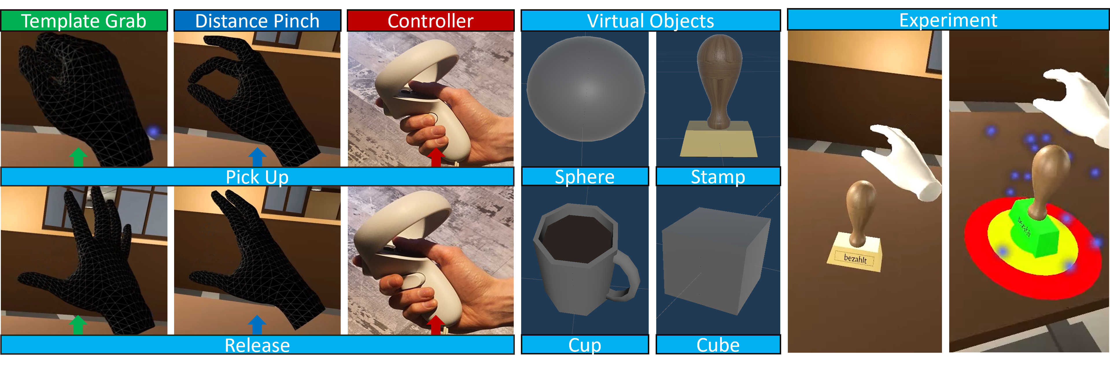 Grabbing virtual objects is one of the essential tasks for Augmented, Virtual, and Mixed Reality applications. Modern applications usually use a simple pinch gesture for grabbing and moving objects. However, picking up objects by pinching has disadvantages. It can be an unnatural gesture to pick up objects and prevents the implementation of other gestures which would be performed with thumb and index. Therefore it is not the optimal choice for many applications. In this work, different implementations for grabbing and placing virtual objects are proposed and compared. Performance and accuracy of the proposed techniques are measured and compared.