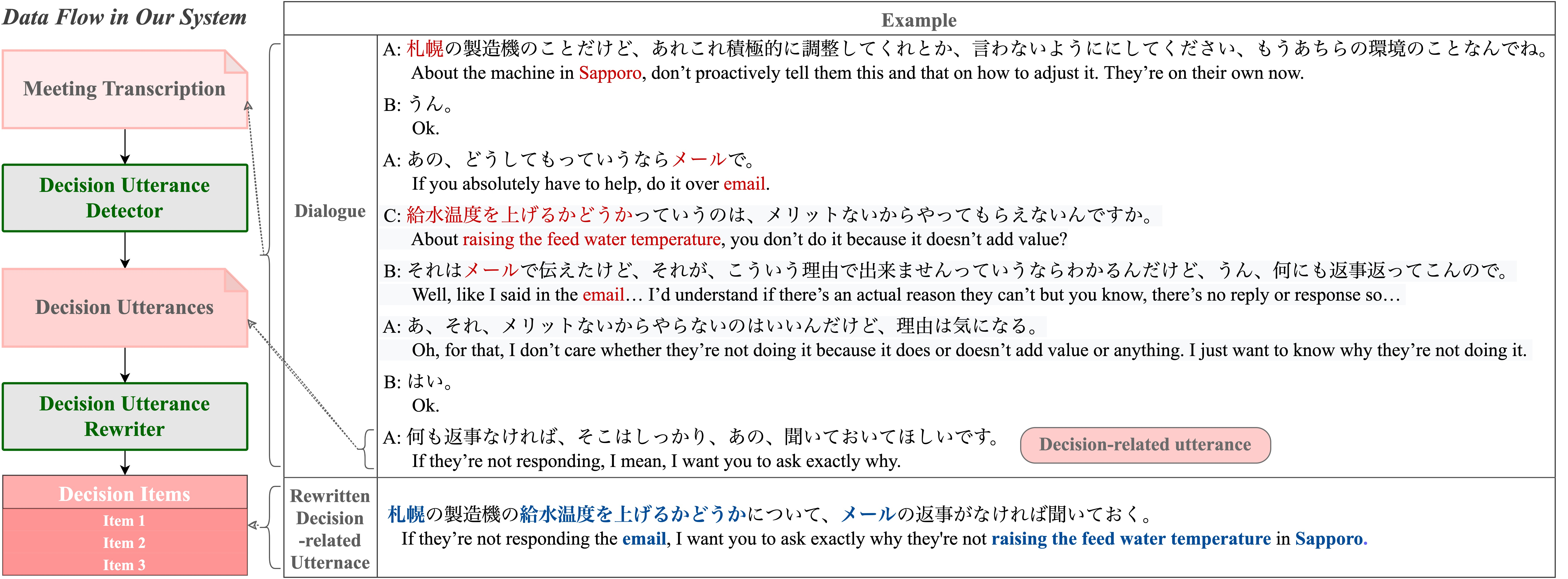 翻译:会议是商业和项目合作决策的普遍过程,在日常会议上自动逐项决定的能力使得能够对过去的讨论进行广泛跟踪。为此,我们开发了会议决定跟踪器,这是一个构建决定项目的原型系统,由决定倾述检测器和决定倾述重写组成。我们显示,DUR通过处理自然对话的倾述崩溃,为改进用户经验作出了巨大贡献。我们系统的介绍视频也可在https://youtu.be/TG1pJJo0Iqo上查阅。