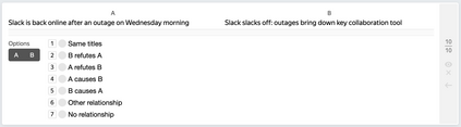 翻译:检测文本中的隐含因果关系是一项需要常识和世界知识的任务。现有的数据集要么侧重于常识因果推理,要么侧重于明显的因果关系。在这项工作中,我们展示了标题“因果关系 ”, 这是用于检测新闻头条新闻之间隐含因果关系的数据集。数据集包括来自英国新闻的5 000多条头条新闻和来自俄罗斯新闻的9 000多条头条新闻,通过众包标注。这些对子从完全不相干或属于同一一般专题,到包括因果关系和反驳关系。我们还展示了一组模型和实验,以证明数据集的有效性,包括基于多语言的因果性检测XLM-ROBERTA模型和基于GPT-2的可能效果预测模型。