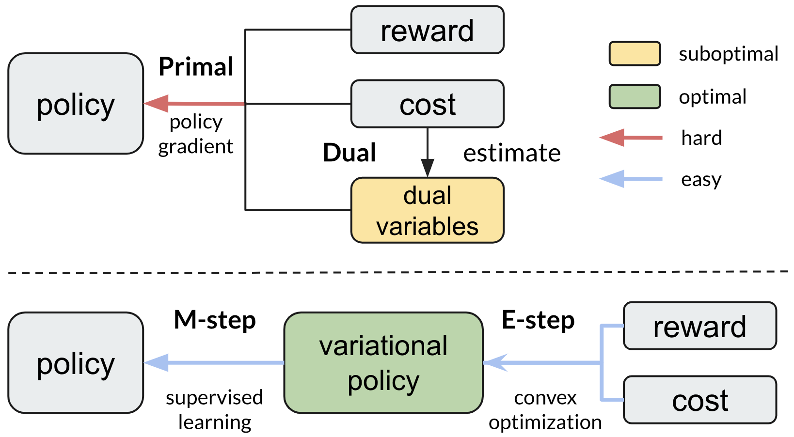 翻译:安全强化学习(RL)旨在学习满足某些限制的政策,然后将其部署到安全关键应用中。以前的初等风格方法存在不稳定问题,缺乏最佳的保障。本文从概率推论的角度克服了问题。我们引入了新的期望-最大化方法,自然地将政策学习过程中的制约因素纳入其中:1) 在调控优化后,可以以封闭的形式计算出一个可证实的最佳非参数差异分布;2) 政策参数在信任区域内根据最佳的变异分布(M-step)得到改进。提议的算法将安全RL问题分解成一个凝固优化阶段和一个有监督的学习阶段,从而产生更稳定的培训绩效。关于连续机器人任务的广泛实验表明,拟议的方法比基线大大改进了满意度和样本效率。该代码可在https://github.com/liuzuxin/cvpo-safe-rl查阅。