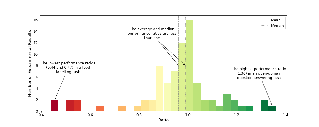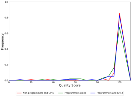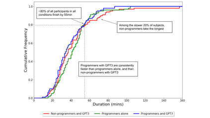 翻译:将计算机性能与人类性能进行比较的图灵测试是众所周知的,但令人惊讶的是,在比较人类性能与人类性能相比是否比单独、计算机或其它基线表现得更好方面没有广泛使用的测试。在这里,我们展示了如何使用手段比率作为衡量效果大小的尺度来进行这种测试。然后我们用三种方式展示了这一测试的使用情况。首先,在对最近公布的79项实验结果的分析中,我们发现,令人惊讶的是,一半以上的研究发现性能下降,业绩改进的平均和中位比率大约为1个(对完全没有改进的响应),而最高比率为1.36个(36%的改进)。第二,我们实验性能改进率是否在100个人类程序员使用GPT-3生成软件时得到更高水平的测试,这是一种大规模、最先进的人工智能系统。我们发现,速度改进率为1.27(27%的改进 ) 。最后,我们发现,使用GPT-3的50个非程序员既能完成这项任务,也比计算机型号要低得多,但光是无法执行的计算机。