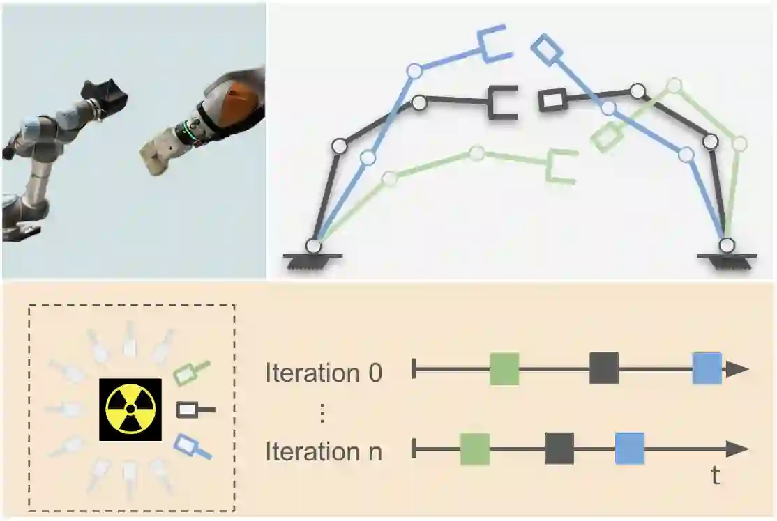 This paper presents ETA-IK, a novel Execution-Time-Aware Inverse Kinematics method tailored for dual-arm robotic systems. The primary goal is to optimize motion execution time by leveraging the redundancy of both arms, specifically in tasks where only the relative pose of the robots is constrained, such as dual-arm scanning of unknown objects. Unlike traditional inverse kinematics methods that use surrogate metrics such as joint configuration distance, our method incorporates direct motion execution time and implicit collisions into the optimization process, thereby finding target joints that allow subsequent trajectory generation to get more efficient and collision-free motion. A neural network based execution time approximator is employed to predict time-efficient joint configurations while accounting for potential collisions. Through experimental evaluation on a system composed of a UR5 and a KUKA iiwa robot, we demonstrate significant reductions in execution time. The proposed method outperforms conventional approaches, showing improved motion efficiency without sacrificing positioning accuracy. These results highlight the potential of ETA-IK to improve the performance of dual-arm systems in applications, where efficiency and safety are paramount.