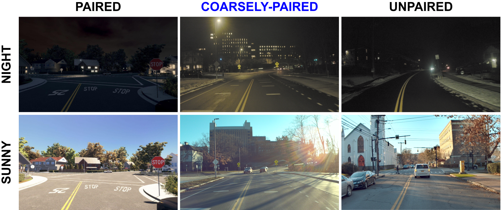 A self-driving car must be able to reliably handle adverse weather conditions (e.g., snowy) to operate safely. In this paper, we investigate the idea of turning sensor inputs (i.e., images) captured in an adverse condition into a benign one (i.e., sunny), upon which the downstream tasks (e.g., semantic segmentation) can attain high accuracy. Prior work primarily formulates this as an unpaired image-to-image translation problem due to the lack of paired images captured under the exact same camera poses and semantic layouts. While perfectly-aligned images are not available, one can easily obtain coarsely-paired images. For instance, many people drive the same routes daily in both good and adverse weather; thus, images captured at close-by GPS locations can form a pair. Though data from repeated traversals are unlikely to capture the same foreground objects, we posit that they provide rich contextual information to supervise the image translation model. To this end, we propose a novel training objective leveraging coarsely-aligned image pairs. We show that our coarsely-aligned training scheme leads to a better image translation quality and improved downstream tasks, such as semantic segmentation, monocular depth estimation, and visual localization.