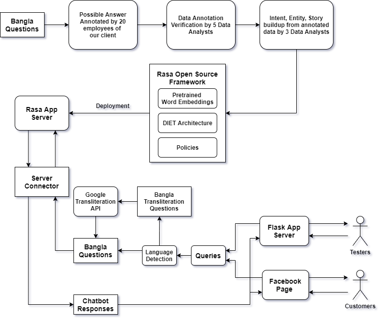 Chatbots are intelligent software built to be used as a replacement for human interaction. However, existing studies typically do not provide enough support for low-resource languages like Bangla. Moreover, due to the increasing popularity of social media, we can also see the rise of interactions in Bangla transliteration (mostly in English) among the native Bangla speakers. In this paper, we propose a novel approach to build a Bangla chatbot aimed to be used as a business assistant which can communicate in Bangla and Bangla Transliteration in English with high confidence consistently. Since annotated data was not available for this purpose, we had to work on the whole machine learning life cycle (data preparation, machine learning modeling, and model deployment) using Rasa Open Source Framework, fastText embeddings, Polyglot embeddings, Flask, and other systems as building blocks. While working with the skewed annotated dataset, we try out different setups and pipelines to evaluate which works best and provide possible reasoning behind the observed results. Finally, we present a pipeline for intent classification and entity extraction which achieves reasonable performance (accuracy: 83.02\%, precision: 80.82\%, recall: 83.02\%, F1-score: 80\%).