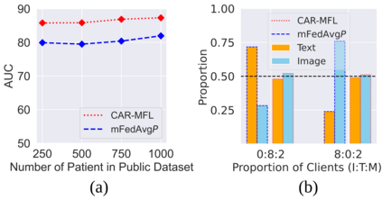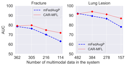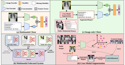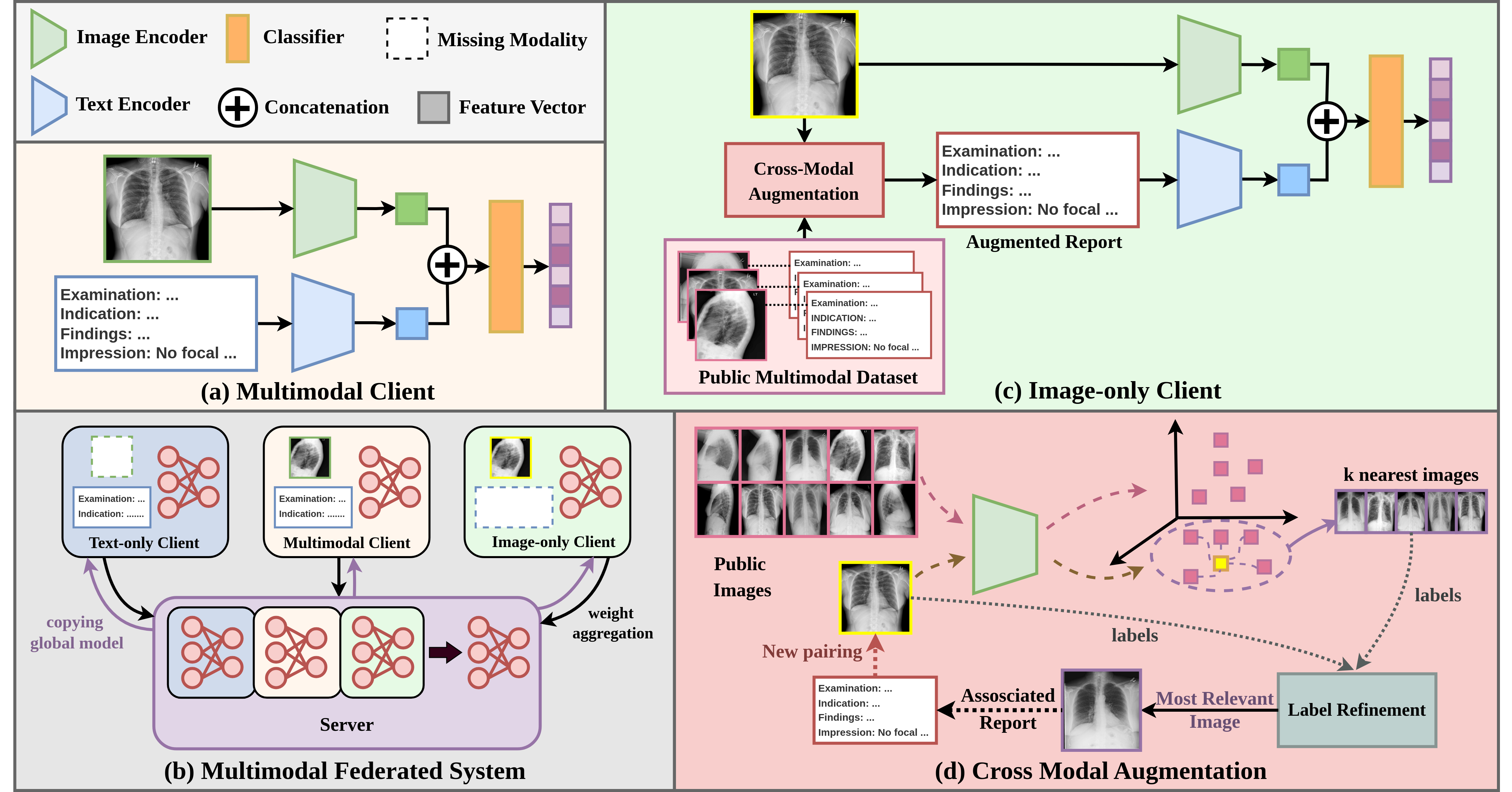 Multimodal AI has demonstrated superior performance over unimodal approaches by leveraging diverse data sources for more comprehensive analysis. However, applying this effectiveness in healthcare is challenging due to the limited availability of public datasets. Federated learning presents an exciting solution, allowing the use of extensive databases from hospitals and health centers without centralizing sensitive data, thus maintaining privacy and security. Yet, research in multimodal federated learning, particularly in scenarios with missing modalities a common issue in healthcare datasets remains scarce, highlighting a critical area for future exploration. Toward this, we propose a novel method for multimodal federated learning with missing modalities. Our contribution lies in a novel cross-modal data augmentation by retrieval, leveraging the small publicly available dataset to fill the missing modalities in the clients. Our method learns the parameters in a federated manner, ensuring privacy protection and improving performance in multiple challenging multimodal benchmarks in the medical domain, surpassing several competitive baselines. Code Available: https://github.com/bhattarailab/CAR-MFL