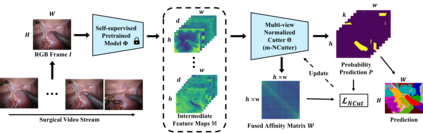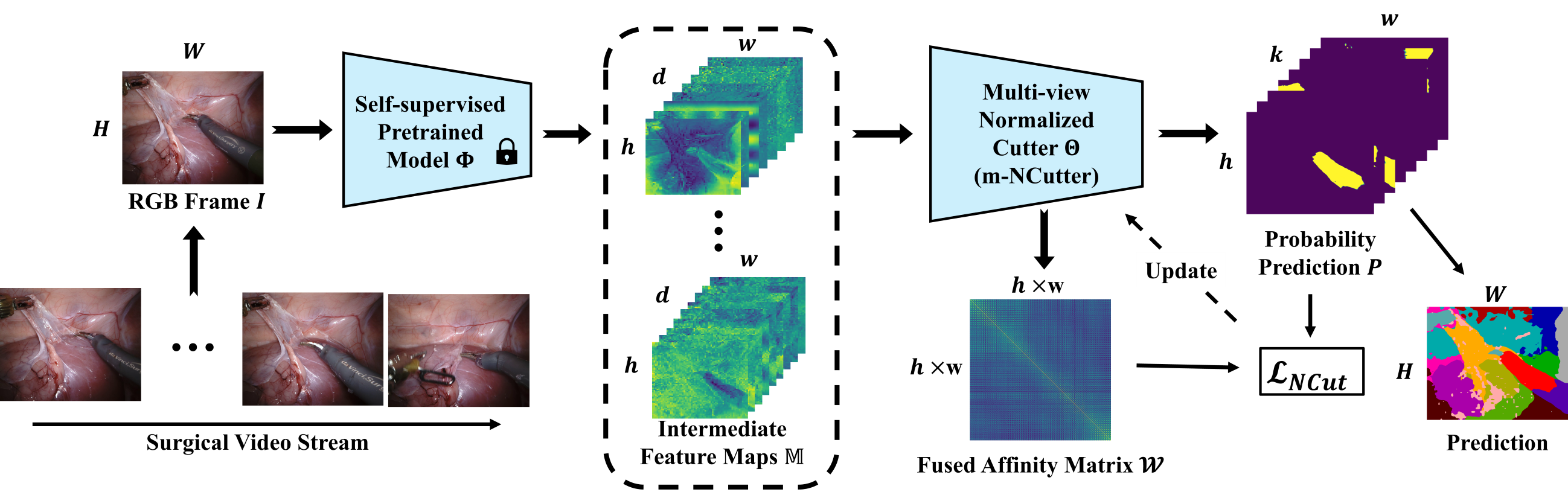Surgical instrument segmentation (SIS) is pivotal for robotic-assisted minimally invasive surgery, assisting surgeons by identifying surgical instruments in endoscopic video frames. Recent unsupervised surgical instrument segmentation (USIS) methods primarily rely on pseudo-labels derived from low-level features such as color and optical flow, but these methods show limited effectiveness and generalizability in complex and unseen endoscopic scenarios. In this work, we propose a label-free unsupervised model featuring a novel module named Multi-View Normalized Cutter (m-NCutter). Different from previous USIS works, our model is trained using a graph-cutting loss function that leverages patch affinities for supervision, eliminating the need for pseudo-labels. The framework adaptively determines which affinities from which levels should be prioritized. Therefore, the low- and high-level features and their affinities are effectively integrated to train a label-free unsupervised model, showing superior effectiveness and generalization ability. We conduct comprehensive experiments across multiple SIS datasets to validate our approach's state-of-the-art (SOTA) performance, robustness, and exceptional potential as a pre-trained model. Our code is released at https://github.com/MingyuShengSMY/AMNCutter.