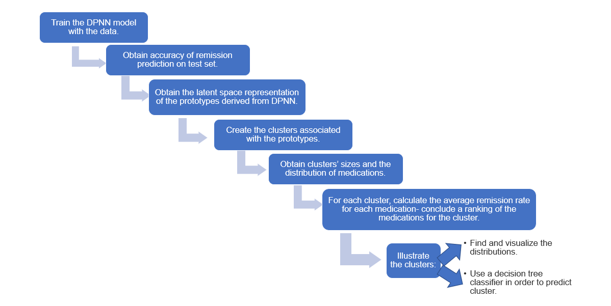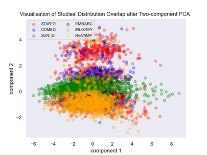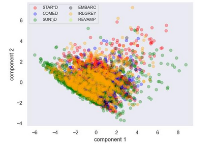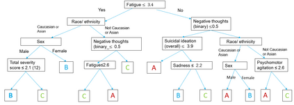 翻译:抑郁症是一种异质性疾病,多种潜在的神经生物学基础可能与治疗反应的变异有关。了解这种变异的来源并预测结果一直是困难的。机器学习在预测MDD治疗反应方面显示出了潜力,但其局限性在于机器学习模型的临床可解释性不足。我们利用差异原型神经网络(DPNN)分析了6个药物治疗抑郁症的临床试验数据(总样本量n = 5438),这是一种神经网络模型,它可以得出治疗相关的患者集簇,同时学习生成差异性治疗反应的概率,其中利用了辅助性临床和基本数据信息。我们使用这个模型训练了一个分类缓解的模型,并对五种一线单药和三种联合治疗进行个体缓解概率输出。根据曲线下面积(AUC)和模型引导治疗中预期的人群缓解率提高来测量模型的有效性和临床效用。后续分析利用了在训练期间学习的患者原型产生集群(亚群)。通过评估特征分布和治疗特异性结果之间的差异,评估了原型的可解释性。一个3-原型模型达到了0.66的AUC和对人口缓解率的预期绝对提高,这些结果比样本缓解率高。我们确定了三个与治疗相关的患者集群,它们在临床上是可解释的。使用机器学习模型可以生成新的与治疗相关的患者配置文件,这可能改善抑郁症的精准医学。注意:该模型当前不是任何主动临床试验的研究对象,也不是用于临床目的的。