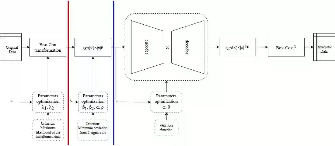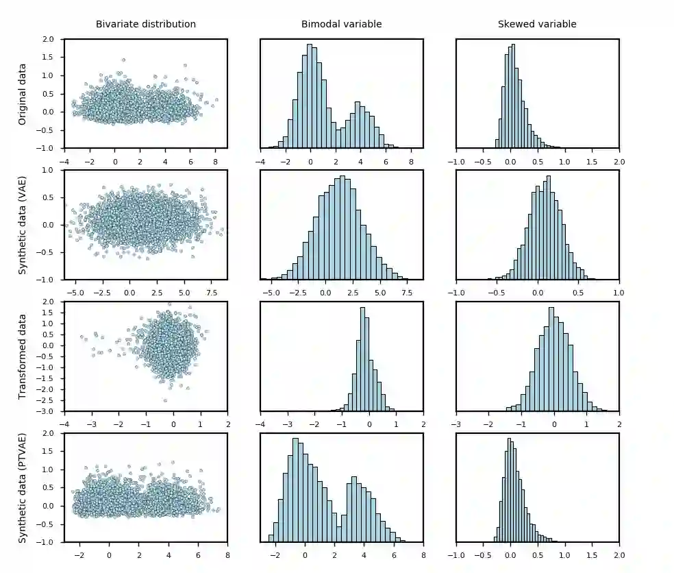 翻译:合成数据生成对于多种应用,例如隐私保护,具有极大的兴趣。深基因模型,例如变异自动编码器(VAEs),是利用原始数据创建此类合成数据集的流行方法。尽管VAEs取得了成功,但是在双式和偏斜边缘分布方面存在着局限性。它们不同于通常用于VAEs潜在代表的正常假设所鼓励的单式对称分布。虽然有一些扩展,假定了潜在空间的其他分布,但通常不会增加数据在许多不同分布中的灵活性。因此,我们提出了一个创新方法,即变异前变异自动编码器(PTVAEs),具体处理双式和偏斜式数据,在原始变量一级采用预变形和偏斜式数据分布。使用两种变异类型使数据接近于正常分布,在数据集中对每种变量进行单独的参数优化。我们用我们的方法的性能与其他状态-艺术方法在合成数据生成方面的弹性方法相比,我们提出了一种新颖的方法,在图像-变异性数据生成中,我们用另一种变异的定量方法来显示另一个变异性方法。
