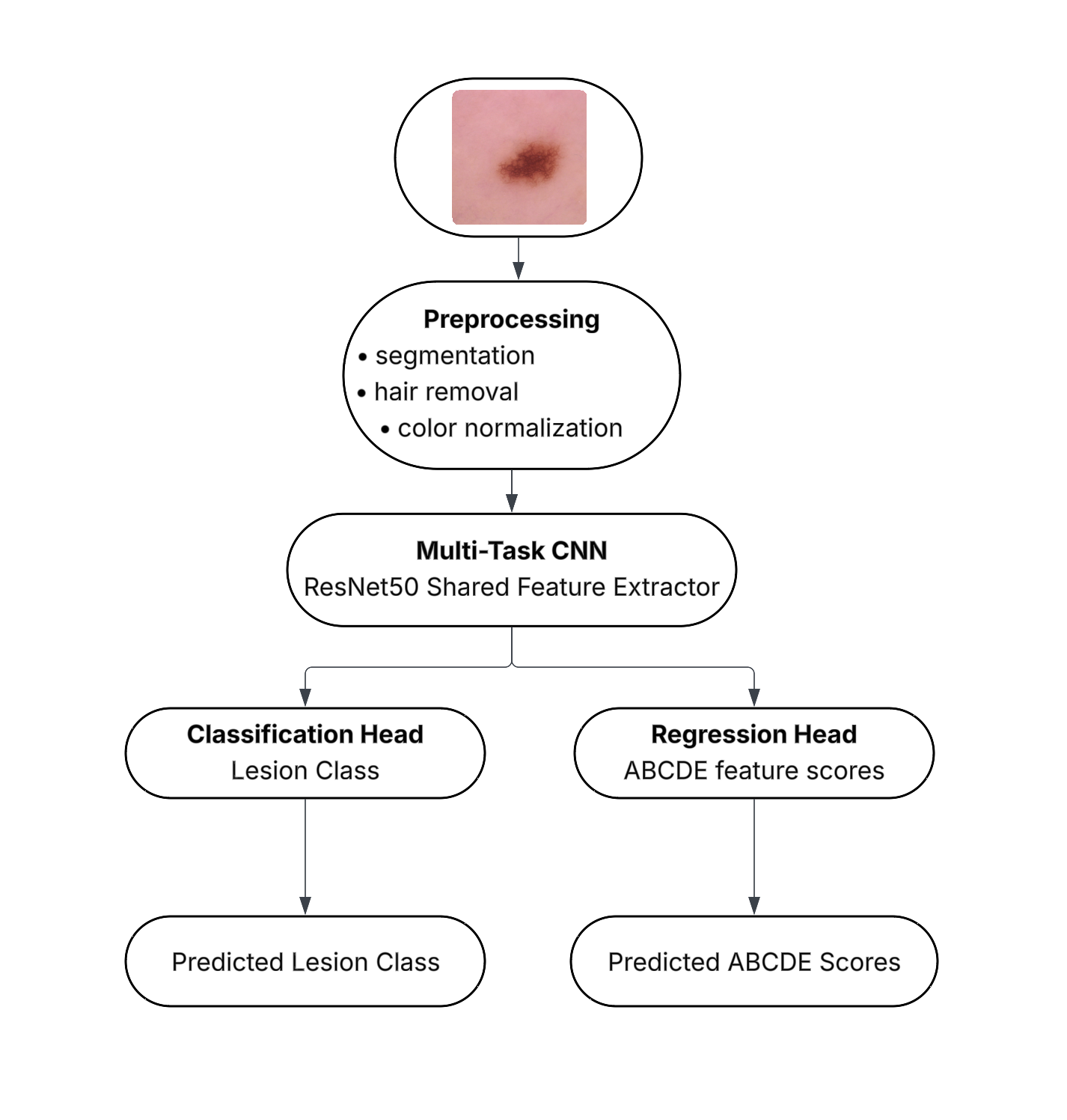 Early detection of melanoma has grown to be essential because it significantly improves survival rates, but automated analysis of skin lesions still remains challenging. ABCDE, which stands for Asymmetry, Border irregularity, Color variation, Diameter, and Evolving, is a well-known classification method for skin lesions, but most deep learning mechanisms treat it as a black box, as most of the human interpretable features are not explained. In this work, we propose a deep learning framework that both classifies skin lesions into categories and also quantifies scores for each ABCD feature. It simulates the evolution of these features over time in order to represent the E aspect, opening more windows for future exploration. The A, B, C, and D values are quantified particularly within this work. Moreover, this framework also visualizes ABCD feature trajectories in latent space as skin lesions evolve from benign nevuses to malignant melanoma. The experiments are conducted using the HAM10000 dataset that contains around ten thousand images of skin lesions of varying stages. In summary, the classification worked with an accuracy of around 89 percent, with melanoma AUC being 0.96, while the feature evaluation performed well in predicting asymmetry, color variation, and diameter, though border irregularity remains more difficult to model. Overall, this work provides a deep learning framework that will allow doctors to link ML diagnoses to clinically relevant criteria, thus improving our understanding of skin cancer progression.