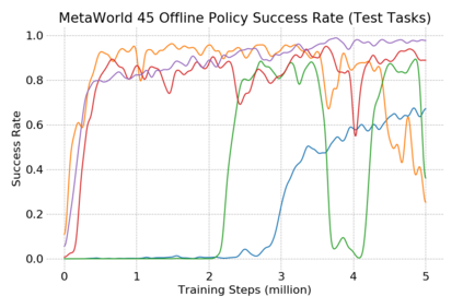 翻译:本文介绍了离线元加强学习(脱线元RL)问题设置,并提出了一个在这个设置中表现良好的算法。离线元加强学习(脱线元RL)类似于广泛成功、监督下的预培训模式,即对大量固定的、预收集的数据(可能来自各种任务)进行预培训,并将模型微调到新任务中,数据相对较少。也就是说,在离线元加强学习(脱线)中,我们在固定的、预收集的一些任务中,对固定的、预收集的数据进行元培训,以适应新任务,新任务中数据数量极小(低于5个目标)的新任务。从离线上看,离线的元加强学习(离线的)新任务和(b)有限的测试任务中的数据,我们既在离线进行离线的MERL数据分析,又在离线培训过程中利用最大可能不安全的或昂贵的数据收集。这就继承了离线的RL的挑战,但是,因为离线的RL一般不考虑向新的任务转移,或者从b)从测试任务中取得有限的数据,我们既在离线进行离线的离线的离线的MER结果的升级的上,我们提议在离线前的升级的升级的升级的升级的升级的模型的升级的升级的升级的升级的升级的升级的升级的升级的计算。