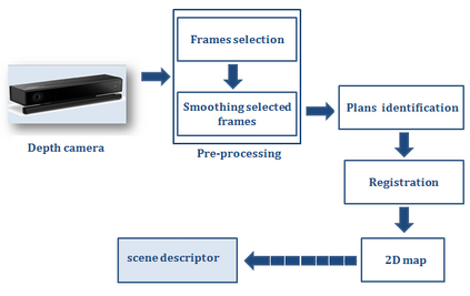 This work proposes a new method for place recognition based on the scene architecture. From depth video, we compute the 3D model and we derive and describe geometrically the 2D map from which the scene descriptor is deduced to constitute the core of the proposed algorithm. The obtained results show the efficiency and the robustness of the propounded descriptor to scene appearance changes and light variations.