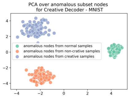 Deep generative models, such as Variational Autoencoders (VAEs), have been employed widely in computational creativity research. However, such models discourage out-of-distribution generation to avoid spurious sample generation, limiting their creativity. Thus, incorporating research on human creativity into generative deep learning techniques presents an opportunity to make their outputs more compelling and human-like. As we see the emergence of generative models directed to creativity research, a need for machine learning-based surrogate metrics to characterize creative output from these models is imperative. We propose group-based subset scanning to quantify, detect, and characterize creative processes by detecting a subset of anomalous node-activations in the hidden layers of generative models. Our experiments on original, typically decoded, and "creatively decoded" (Das et al 2020) image datasets reveal that the proposed subset scores distribution is more useful for detecting creative processes in the activation space rather than the pixel space. Further, we found that creative samples generate larger subsets of anomalies than normal or non-creative samples across datasets. The node activations highlighted during the creative decoding process are different from those responsible for normal sample generation.