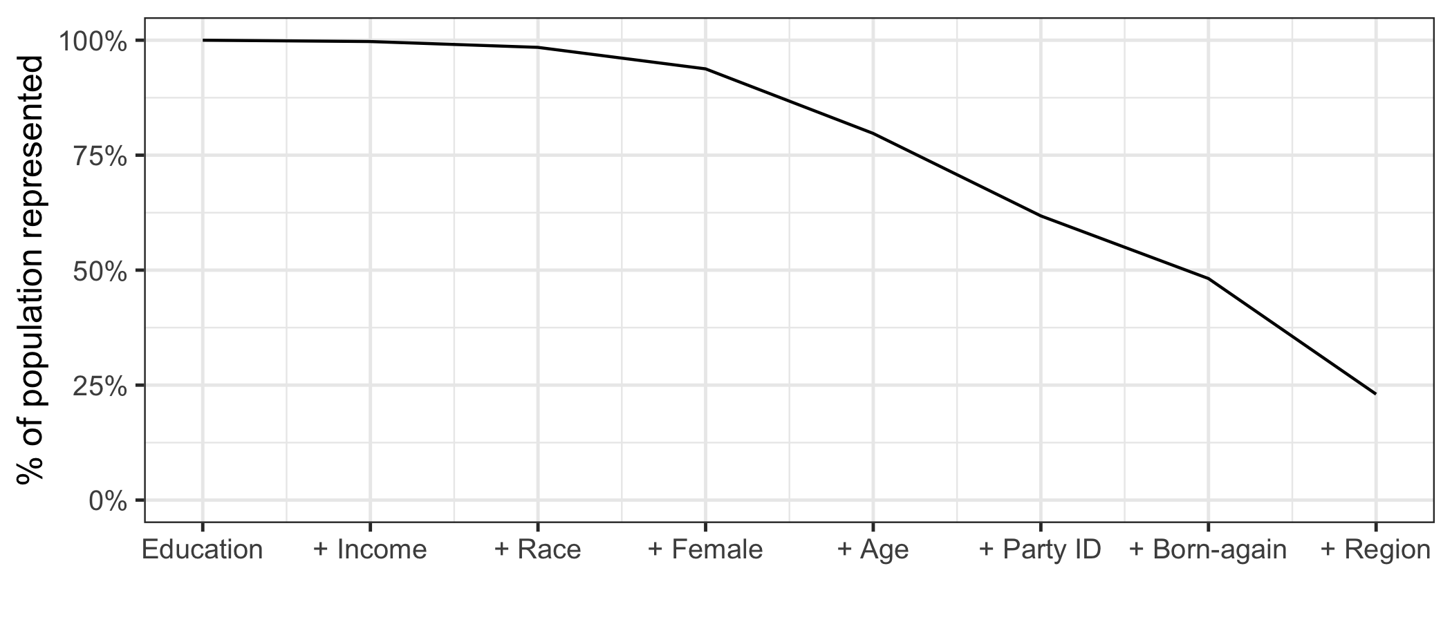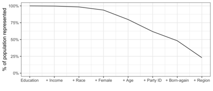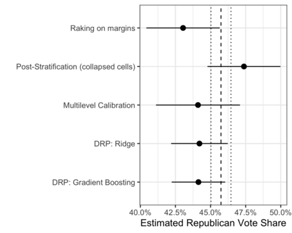 翻译:在2016年11月的美国总统选举中,许多州一级的民意测验,特别是在上中西部州,错误地预测了获胜候选人。对本次投票空缺的一个主要解释是,传统投票响应率的急剧下降导致更多地依赖统计方法来调整相应的偏差,而这些方法未能适应教育、种族和地理区域等关键变量之间的重要互动。在传统调查方法中,许多州一级的民意测验,特别是在上中西部州,错误地预测了获胜候选人。许多州一级的民意测验,特别是在上中西部州,错误地预测了获胜候选人。这次投票空缺的一个主要解释是:传统调查方法仍然具有挑战性:通常只平衡差额,而完全平衡所有互动的州一级的民意测验后,只有一小部分变量才可行。在本文件中,我们建议多层次校准校准校准加权,对边际平衡和较松散的对更高级别互动的限制。这包括了批准后的一些好处,同时保留了萎缩的保证。我们随后纠正了由于通过灵活的结果模式放松限制而产生的偏差造成的偏差;我们称之为“双级回归”和“事后批准”的方法(DP)。我们将这些这些估定这些“偏差者”的“选择”的属性属性属性属性属性属性属性特性描述这些“衡量”的“衡量”的“衡量”的“衡量”和“时,并展示”的“选择”的“选择”的“选择”的“选举”的“选举”的“比例”是“结果”的“结果的“结果的“结果的“结果”的“结果”的“比例”方法,显示的“我们”是“我们”的“我们”的“我们”的“对”的“选择”的“选择”的“选择”的“选择”的“在”的“选择”的“选择”的“选择”的“在”的“选择”的“选择”的“在”的“选择”的“在”的“在”的“选择”的“在”的“在”的“在”的“在”的“在”的“在”的“在”的“在”中,在”的“在”的“在”的“在”中,在”的“在”的“在”的“在”中,在”的“在”的“在”中,在”中进行中的“在”中进行中的“