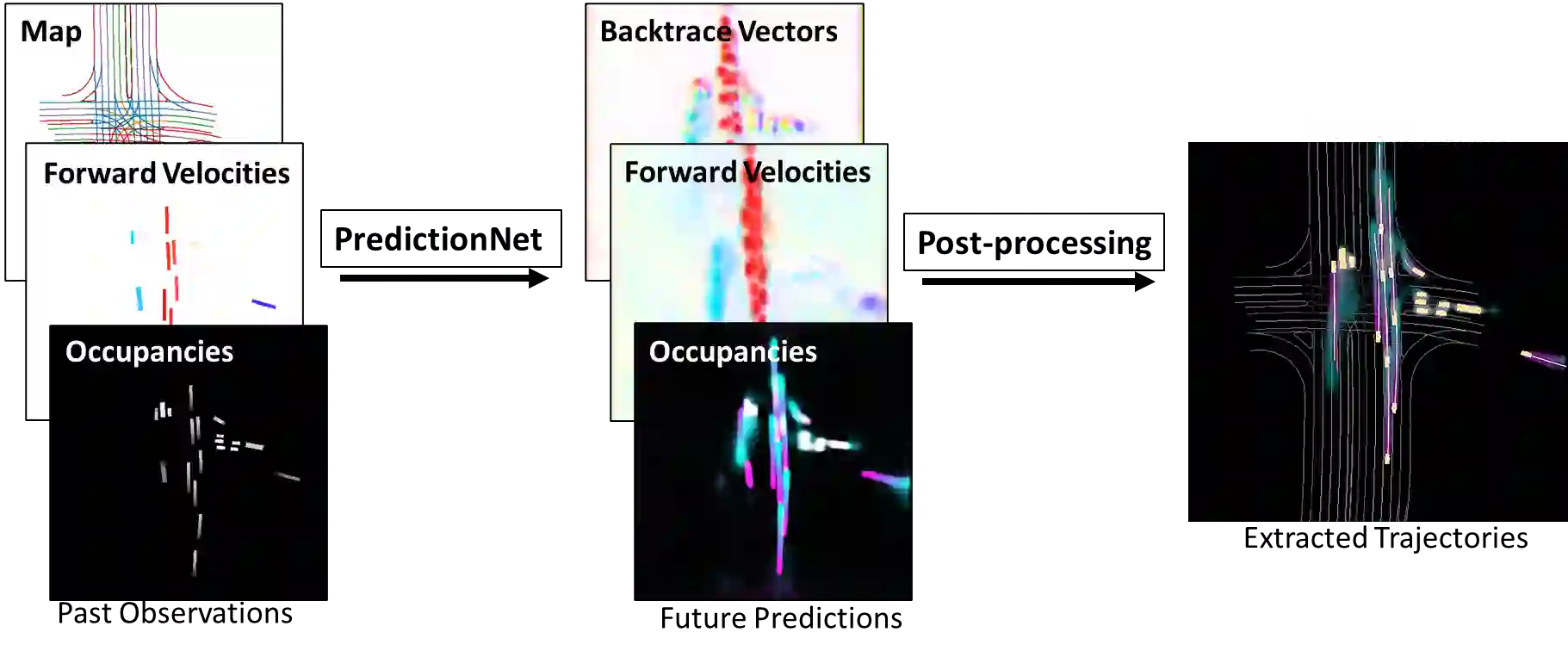 Predicting the future motion of traffic agents is crucial for safe and efficient autonomous driving. To this end, we present PredictionNet, a deep neural network (DNN) that predicts the motion of all surrounding traffic agents together with the ego-vehicle's motion. All predictions are probabilistic and are represented in a simple top-down rasterization that allows an arbitrary number of agents. Conditioned on a multi-layer map with lane information, the network outputs future positions, velocities, and backtrace vectors jointly for all agents including the ego-vehicle in a single pass. Trajectories are then extracted from the output. The network can be used to simulate realistic traffic, and it produces competitive results on popular benchmarks. More importantly, it has been used to successfully control a real-world vehicle for hundreds of kilometers, by combining it with a motion planning/control subsystem. The network runs faster than real-time on an embedded GPU, and the system shows good generalization (across sensory modalities and locations) due to the choice of input representation. Furthermore, we demonstrate that by extending the DNN with reinforcement learning (RL), it can better handle rare or unsafe events like aggressive maneuvers and crashes.
