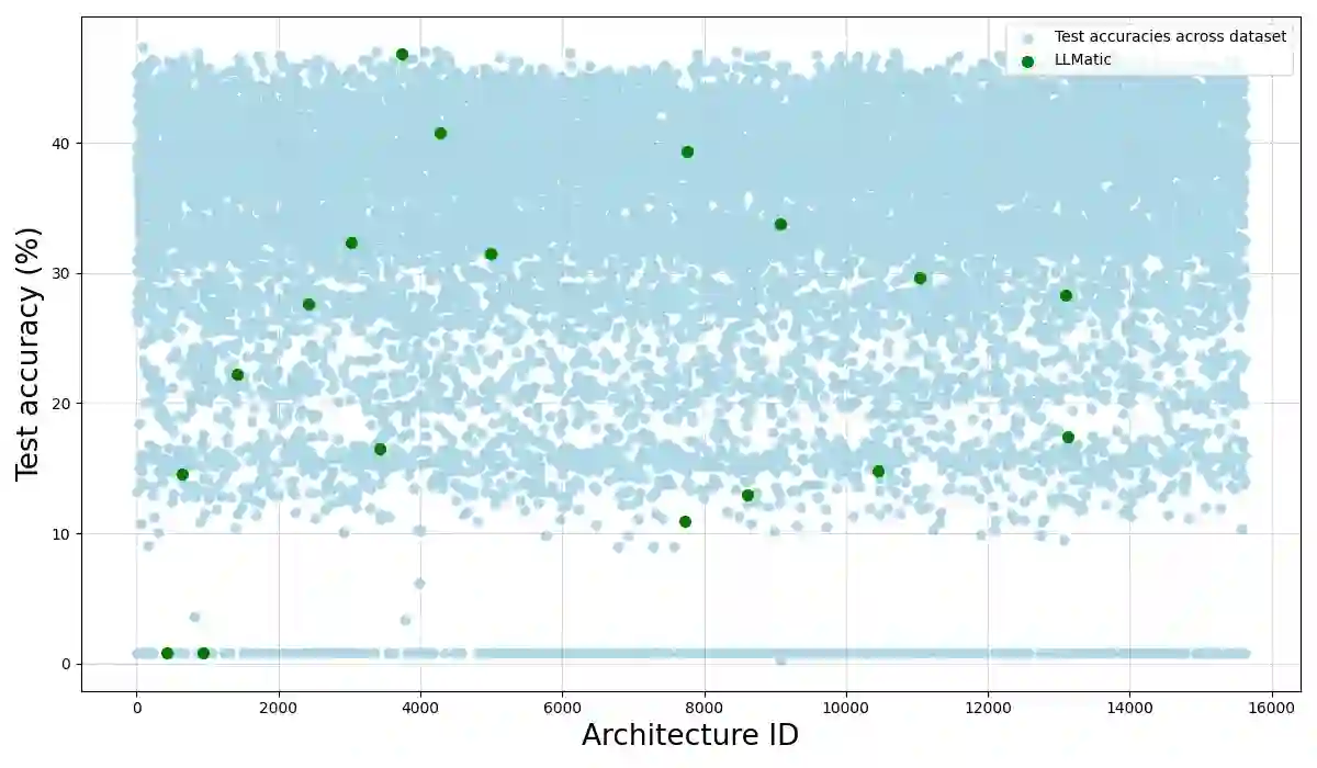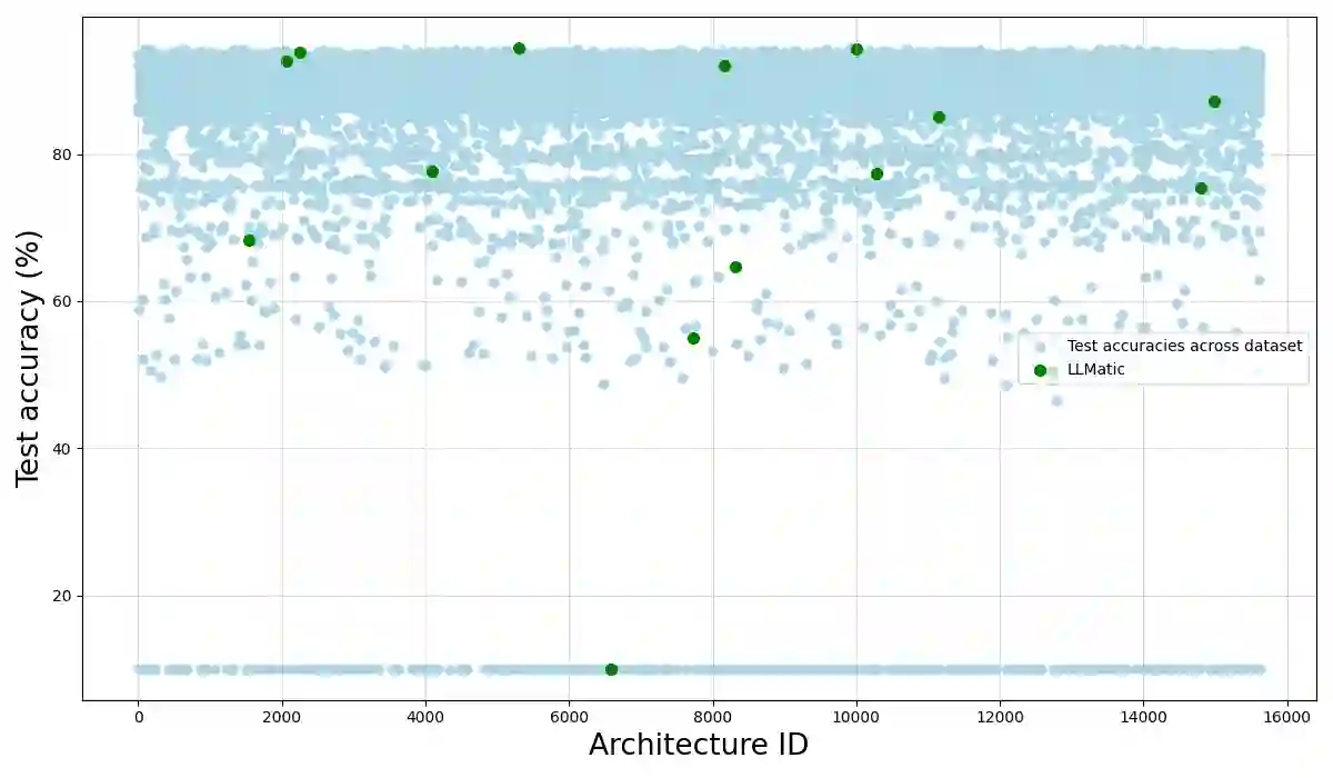Large Language Models (LLMs) have emerged as powerful tools capable of accomplishing a broad spectrum of tasks. Their abilities span numerous areas, and one area where they have made a significant impact is in the domain of code generation. In this context, we view LLMs as mutation and crossover tools. Meanwhile, Quality-Diversity (QD) algorithms are known to discover diverse and robust solutions. By merging the code-generating abilities of LLMs with the diversity and robustness of QD solutions, we introduce LLMatic, a Neural Architecture Search (NAS) algorithm. While LLMs struggle to conduct NAS directly through prompts, LLMatic uses a procedural approach, leveraging QD for prompts and network architecture to create diverse and highly performant networks. We test LLMatic on the CIFAR-10 image classification benchmark, demonstrating that it can produce competitive networks with just $2,000$ searches, even without prior knowledge of the benchmark domain or exposure to any previous top-performing models for the benchmark.