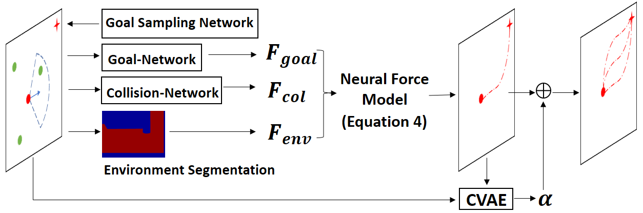翻译:轨迹预测在许多领域得到了广泛的追求,涵盖了基于模型和无模型方法。前者包括基于规则、几何或优化的模型,后者主要由深度学习方法组成。在本文中,我们提出了一种新的方法,将两种方法结合在一起,基于一个新的神经微分方程模型。我们的新模型(神经社交物理学或NSP)是一个深度神经网络,其中我们使用一个显式的物理学模型,具有可学习的参数。显式的物理学模型作为建模行人行为的强归纳偏差,而网络的其余部分提供了系统参数估计和动力随机性建模的强数据拟合能力。我们在6个数据集上将NSP与15种最新的深度学习方法进行比较,并将表现提高了5.56%-70%。此外,我们展示了NSP在预测密度是测试数据的2-5倍的截然不同的场景下,具有更好的可推广性,可以预测合理的轨迹。最后,我们展示了NSP中的物理模型可以为人类行为提供合理的解释,而不是一个黑盒子的深度学习模型。代码:https://github.com/realcrane/Human-Trajectory-Prediction-via-Neural-Social-Physics。