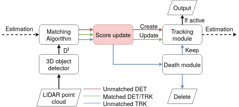 翻译:多球跟踪是自主导航中的一个关键组成部分,因为它为决策提供了宝贵的信息。 许多研究人员通过过滤框架三维探测来完成三维多球跟踪任务; 但是,他们的重点主要在于寻找有用的特征或适当的匹配度量。 我们的工作侧重于追踪系统中一个被忽视的部分: 评分改进和跟踪结束。 我们显示,在根据轨迹评分结束轨道时,根据时间一致性来操纵评分可以改进跟踪结果。 我们这样做的方法是增加配对的赛道的得分,配有得分更新功能,减少不匹配的赛道分。 与基于计算的方法相比,我们的方法在使用不同数据集的各种探测器和筛选算法时,始终产生更好的AMOTA和MOTA的得分。 AMOTA的得分在MOTA评分上升到1.83和2.96。 我们还使用我们的方法作为迟融合组合方法,并且用一个坚实的比基于投票的组合方法要好。 它在以67.6的AMOTA评分中, 在使用各种探测器/Cengius com 进行其他可比较的代码测试。