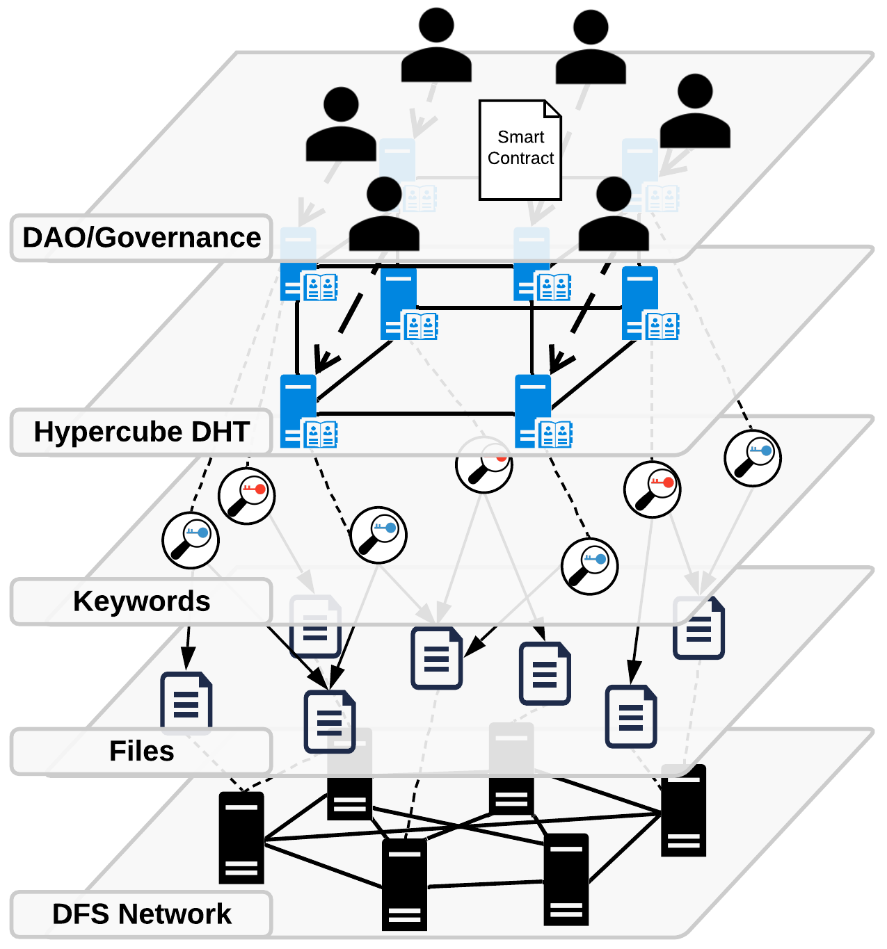 翻译:最近,出现了新一代P2P系统,能够处理数据完整性和真实性,用于开发“更多”分散式互联网的新应用程序,即分散式Ledger技术(DLT)和分散式文件系统(DFS),然而,这些技术仍然有一些未解决的问题,大多与数据查找和发现有关。在本文件中,我们首先提议了一个分散式散沙表(DHT)系统,以有效管理在DF储存的数据上执行的分散式关键词查询。通过超立方逻辑布局,在网络之间有效地进行查询,每个节点负责具体的关键词组和相关内容。第二,我们根据分散式自动组织(DAO)的实施,为上述网络的治理提供了一个框架。我们展示了使用智能合同如何使组织决策得以进行,并奖励积极促进DT的节点。最后,我们试验性地验证了我们提案的执行情况,在此过程中,对超立方不同逻辑节点执行相同的协议,使我们能够评估网络内的通信效率。