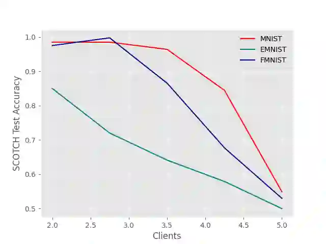 Federated learning enables multiple data owners to jointly train a machine learning model without revealing their private datasets. However, a malicious aggregation server might use the model parameters to derive sensitive information about the training dataset used. To address such leakage, differential privacy and cryptographic techniques have been investigated in prior work, but these often result in large communication overheads or impact model performance. To mitigate this centralization of power, we propose \textsc{Scotch}, a decentralized \textit{m-party} secure-computation framework for federated aggregation that deploys MPC primitives, such as \textit{secret sharing}. Our protocol is simple, efficient, and provides strict privacy guarantees against curious aggregators or colluding data-owners with minimal communication overheads compared to other existing \textit{state-of-the-art} privacy-preserving federated learning frameworks. We evaluate our framework by performing extensive experiments on multiple datasets with promising results. \textsc{Scotch} can train the standard MLP NN with the training dataset split amongst 3 participating users and 3 aggregating servers with 96.57\% accuracy on MNIST, and 98.40\% accuracy on the Extended MNIST (digits) dataset, while providing various optimizations.