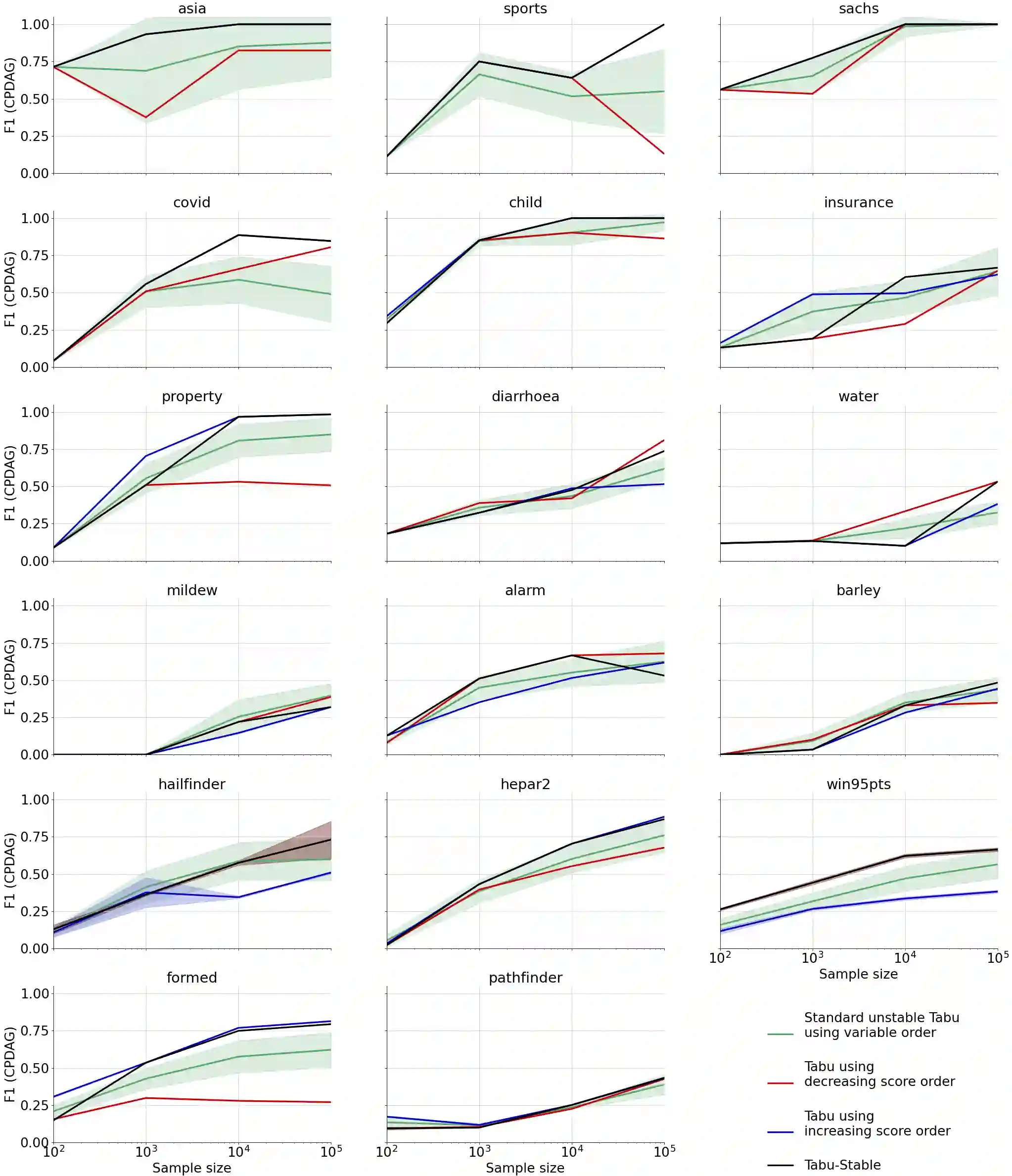 Many Bayesian Network structure learning algorithms are unstable, with the learned graph sensitive to arbitrary dataset artifacts, such as the ordering of columns (i.e., variable order). PC-Stable attempts to address this issue for the widely-used PC algorithm, prompting researchers to use the "stable" version instead. However, this problem seems to have been overlooked for score-based algorithms. In this study, we show that some widely-used score-based algorithms, as well as hybrid and constraint-based algorithms, including PC-Stable, suffer from the same issue. We propose a novel solution for score-based greedy hill-climbing that eliminates instability by determining a stable node order, leading to consistent results regardless of variable ordering. Two implementations, HC-Stable and Tabu-Stable, are introduced. Tabu-Stable achieves the highest BIC scores across all networks, and the highest accuracy for categorical networks. These results highlight the importance of addressing instability in structure learning and provide a robust and practical approach for future applications. This extends the scope and impact of our previous work presented at Probabilistic Graphical Models 2024 by incorporating continuous variables. The implementation, along with usage instructions, is freely available on GitHub at https://github.com/causal-iq/discovery.