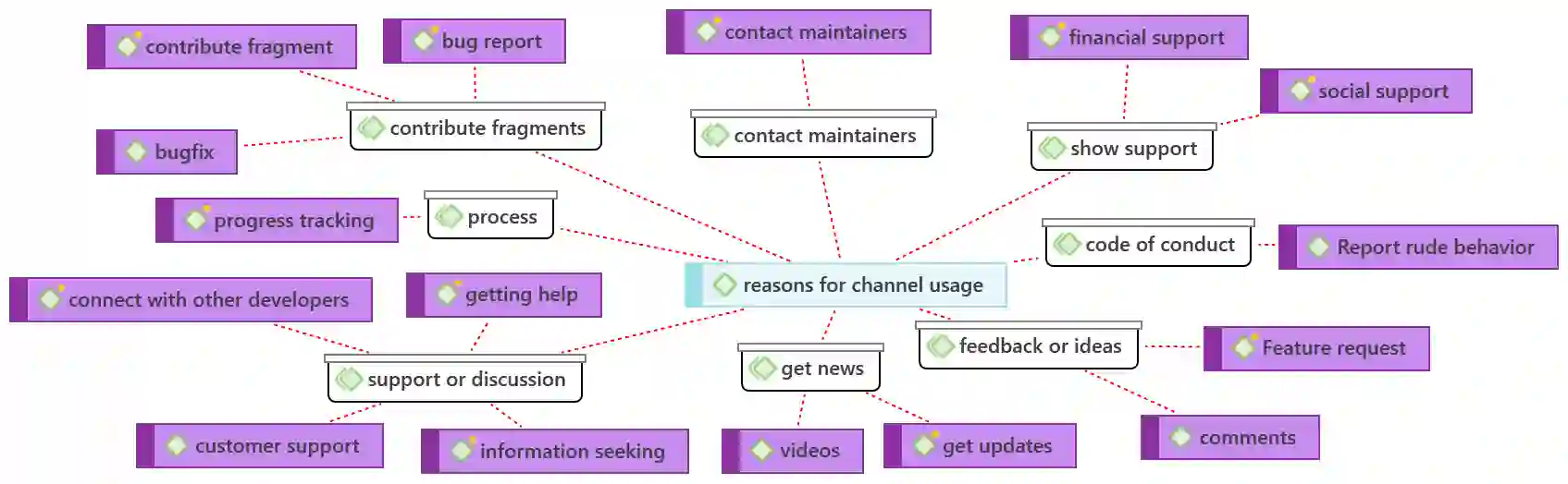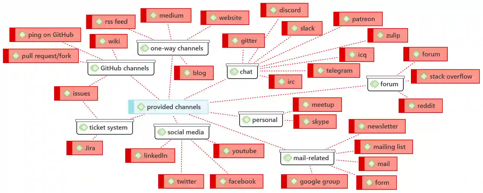 翻译:交流在软件开发中至关重要,在分布式环境中更为重要。 交流活动需要组织和协调,以防范生产力损失、认知负荷增加和团队成员压力的威胁。 由于以前对开放源头项目的研究所查明的通信渠道过多,有必要探索如何引入、解释和激励所有项目成员使用这些通信渠道的组织问题。 在这项研究中,我们希望了解GitHub项目使用哪些通信渠道,以及如何向GitHub项目受众介绍这些渠道。我们利用专题分析来分析90个GitHub项目中的151件艺术品。我们的成果揭示了32个独特的通信渠道,可以分为9种不同类型。项目大多提供不同类型的渠道,但有些类型(例如聊天)通常提供若干渠道。维护者知道这些渠道有不同的特点,帮助开发者决定哪个频道应该用于哪个案例。 但是,并非所有项目都使用这种渠道,而且我们常常没有找到任何明确的理由来让维护者选择在另一个频道上提供一个频道。 不同的渠道可以被明智地用于不同的渠道。