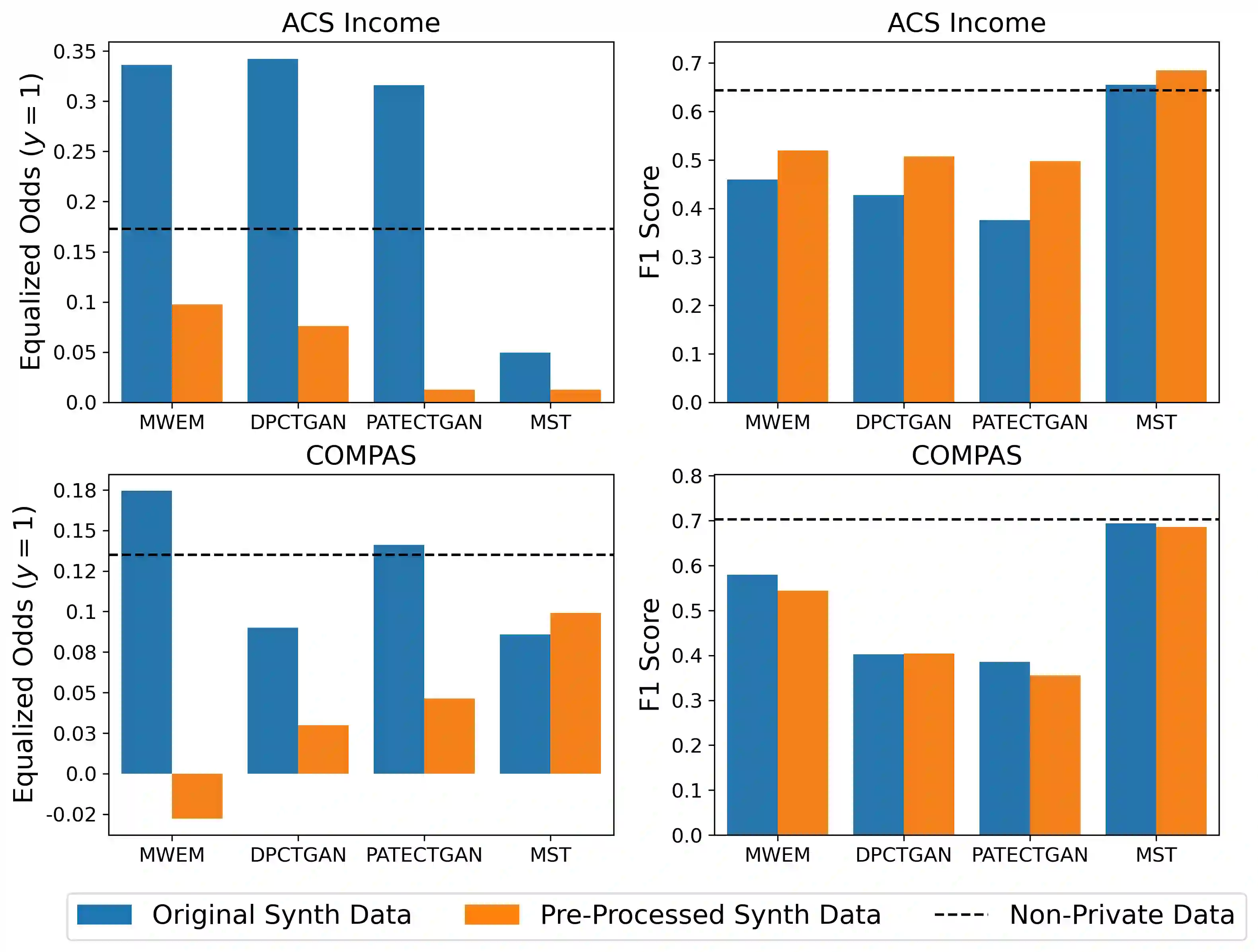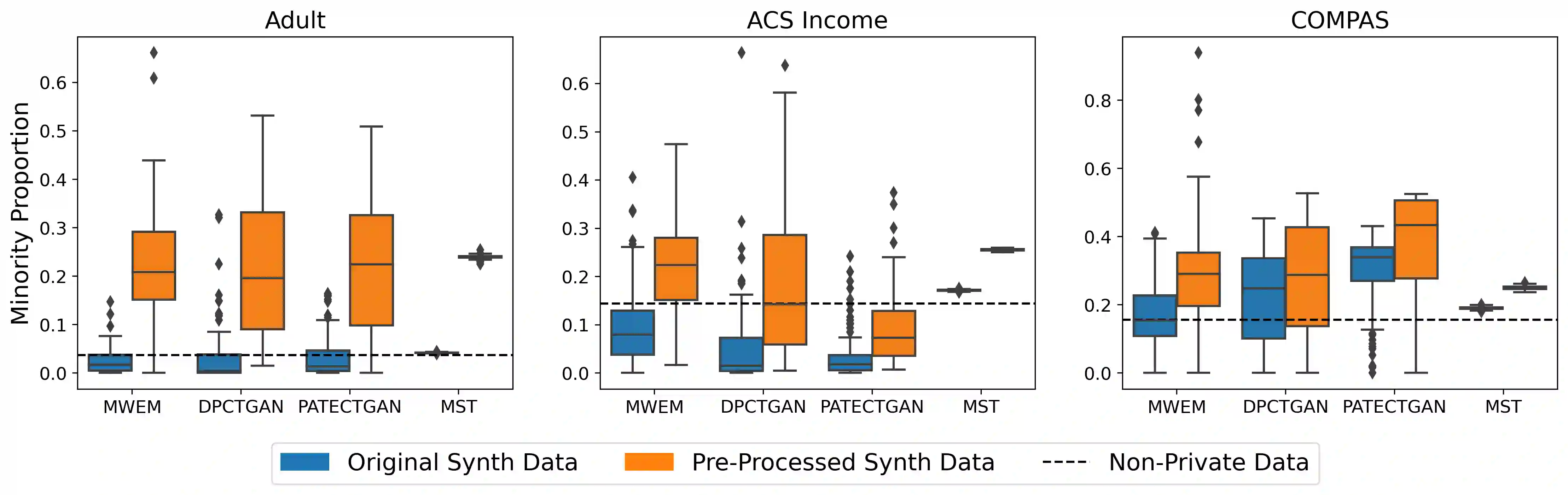 翻译:区别对待的私人(DP)合成数据是最大限度地利用包含敏感信息的数据的一个很有希望的方法。但是,由于压制代表不足的类别,而这种类别往往是实现隐私所必须的,因此可能与公平相冲突。我们评估了四个DP合成器,并介绍了经验结果,表明其中三个模型经常降低下游二元分类任务的公平性结果。我们把所生成的合成数据中存在的少数群体的公平性和比例联系起来,并发现对合成器进行培训,使其了解通过多标签下标方法预先处理的数据,可以促进更公平的结果,而不会降低准确性。