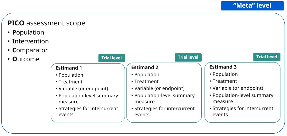 The estimand framework is increasingly established to pose research questions in confirmatory clinical trials. In evidence synthesis, the uptake of estimands has been modest, and the PICO (Population, Intervention, Comparator, Outcome) framework is more often applied. While PICOs and estimands have overlapping elements, the estimand framework explicitly considers different strategies for intercurrent events. We propose a pragmatic framework for the use of estimands in meta-analyses of clinical trials, highlighting the value of estimands to systematically identify and mitigate key sources of quantitative heterogeneity, and to enhance the applicability or external validity of pooled estimates. Focus is placed on the role of strategies for intercurrent events, within the specific context of meta-analyses for health technology assessment. We apply the estimand framework to a network meta-analysis of clinical trials, comparing the efficacy of semaglutide versus dulaglutide in type 2 diabetes. We explore the impact of a treatment policy strategy for treatment discontinuation or initiation of rescue medication versus a hypothetical strategy for the corresponding intercurrent events. The specification of different target estimands at the meta-analytical level allows us to be explicit about the source of heterogeneity, the intercurrent event strategy, driving any potential differences in results. We advocate for the integration of estimands into the planning of meta-analyses, while acknowledging that potential challenges exist in the absence of subject-level data. Estimands can complement PICOs to strengthen communication between stakeholders about what evidence syntheses seek to demonstrate, and to ensure that the generated evidence is maximally relevant to healthcare decision-makers.