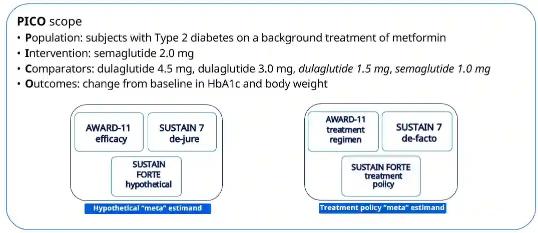 翻译:在确证性临床试验中,估计目标框架正日益成为提出研究问题的既定方法。在证据综合领域,估计目标框架的应用尚不广泛,而PICO(人群、干预、对照、结局)框架则更为常用。尽管PICO与估计目标框架存在重叠要素,但估计目标框架明确考虑了处理并发事件的不同策略。我们提出一个实用的框架,用于在临床试验的荟萃分析中应用估计目标,强调估计目标在系统性识别和减少定量异质性关键来源方面的价值,以及其在提升合并估计值的适用性或外部效度方面的作用。本文重点关注在卫生技术评估的荟萃分析这一特定背景下,处理并发事件的策略所扮演的角色。我们将估计目标框架应用于一项临床试验的网络荟萃分析,比较司美格鲁肽与度拉糖肽在2型糖尿病中的疗效。我们探讨了针对治疗中止或启用急救药物这两种并发事件,采用治疗策略策略与假设性策略所产生的影响。在荟萃分析层面明确不同的目标估计量,使我们能够清晰揭示驱动结果潜在差异的异质性来源——即并发事件处理策略。我们主张将估计目标整合到荟萃分析的规划中,同时承认在缺乏个体水平数据的情况下可能存在挑战。估计目标可作为PICO框架的补充,以加强利益相关方之间关于证据综合旨在证明内容的沟通,并确保生成的证据与医疗决策者的需求高度相关。