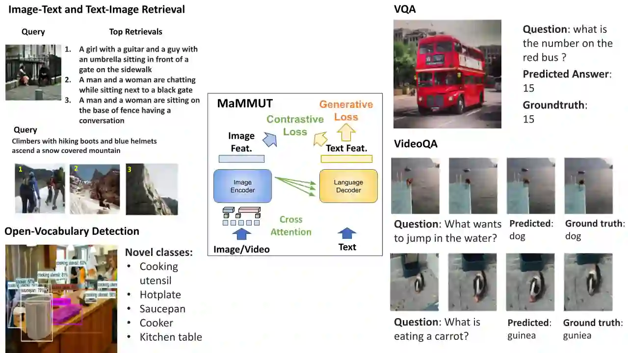 翻译:随着语言模型的发展,从编码器-解码器转向了仅解码器的设计。此外,常见的两种最流行的多模态任务——生成任务和对比任务——往往会相互冲突,难以适应一个体系结构,并且需要对下游任务进行复杂的调整。我们提出了一种新的培训范式,使用解码器专门为多模态任务进行训练,这在联合学习这些不同的视觉语言任务方面非常有效。使用一种简单的模型,称为MaMMUT。它由一个单一的视觉编码器和一个文本解码器组成,并能通过文本解码器上的新的两遍方法适应对比和生成学习。我们证明了这些不同目标任务的联合训练是简单、有效的,并最大化了模型的重复使用。此外,相同的体系结构使开放词汇的物体检测和视频语言任务得到直接扩展。该模型处理了各种任务,同时规模适中。我们的模型在图像-文本和文本-图像检索、视频问答和开放词汇检测任务上实现了SOTA,优于更大、更广泛培训的基础模型。尤其是大小方面,相对于VQA和视频字幕任务,其仍能表现出有竞争力的结果。削弱结果确认我们方法的灵活性和优点。
