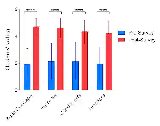 翻译:由于Android智能手机成本低,以及全球社交媒体使用量的增加,非洲出现了智能手机拥有权的迅速增长趋势。根据以前通过面对面方案和在线课程向加纳中、大中学生引入智能电话编码课程的工作,这项工作在2019年通过面对面方案和在线课程向加纳中学生引入了37个国家的非洲人在线智能手机课程。这个为期8周的课程的学生阅读了课程说明,提交了任务,在网上论坛与同龄人和调解人合作,完成了开放和封闭的调查。我们对该课程的数据进行了定性和定量分析。在应用的709名学生中,有210名学生在通过初步任务后被正式录取了课程。在课程结束时,210名学生中有72%完成了课程。此外,学生派任教书和自我报告显示了对方案编制概念的理解,男性和女性之间以及教育层面的类似表现。学生们提到,这些课程说明很容易理解,他们也享受了自己在智能手机上写代码的经验。此外,在应用初步任务完成后,学生们从同侪和调解人那里获得了帮助,在课程应用中学习了各种技能。最后,学习了非洲学习了几个非洲学习工具。