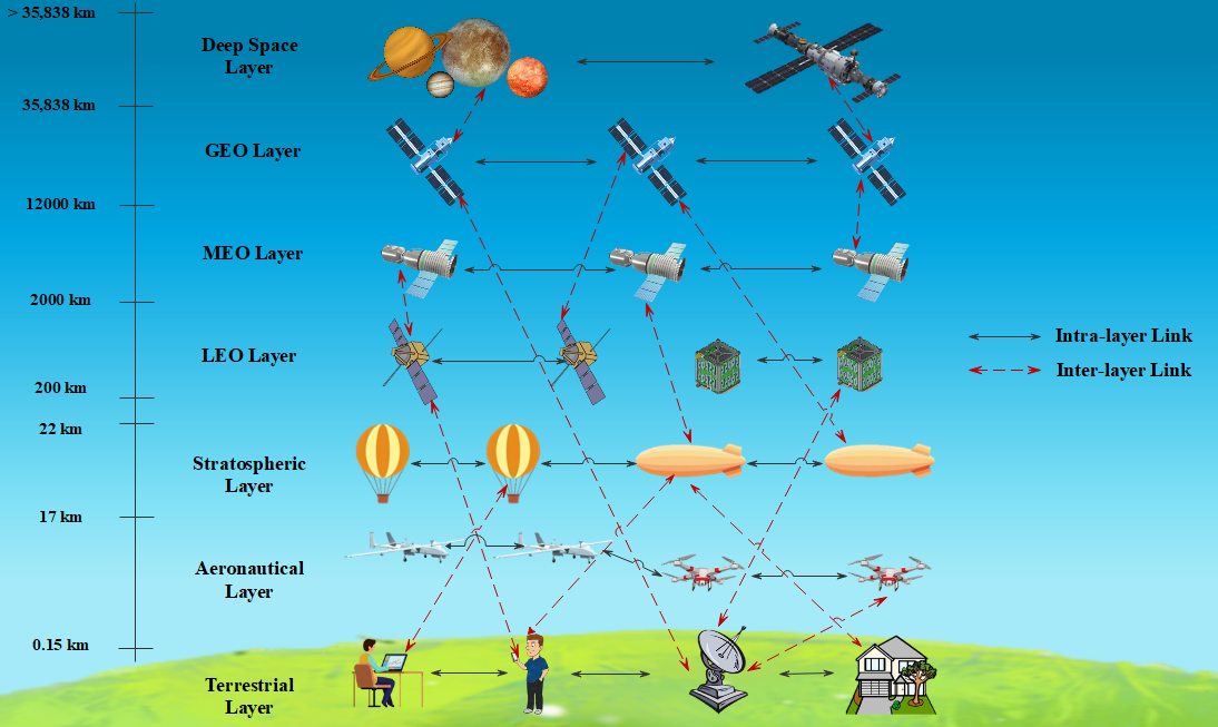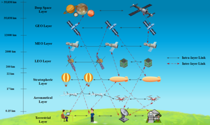 翻译:本文概述了无线网络第六代(6G)的关键推动者之一,即综合卫星-航空网络的点对点连接(P2P),预计这些联系是无线网络第六代(6G)的关键推动者之一,首先概述了这类综合大型复杂网络的独特性,通常以空间网络为标志,并侧重于两个特定的空间-空气基础设施,即卫星网络和高纬度平台(HAPs),然后将连接的P2P通信连接归类为同一层的卫星-卫星连接(SSLL)、不同层次的卫星-卫星连接(SSLD)和HAP-HAP链接(HHL),论文分别概述了这类空间网络的每个层次,并着重介绍了连接(即无线电-频率或自由空间光学)的可能性质,并专门概述了现有的链接预算结果。随后,论文介绍了实现这种综合卫星-卫星-卫星通信网络在服务不足和偏远地区提供宽带服务的潜在好处。最后,论文展示了未来智能空间网络、大规模空间访问网络的智能化、多层空间访问网的智能化、离载式网络的智能化、高载式空间网络、离层网络。