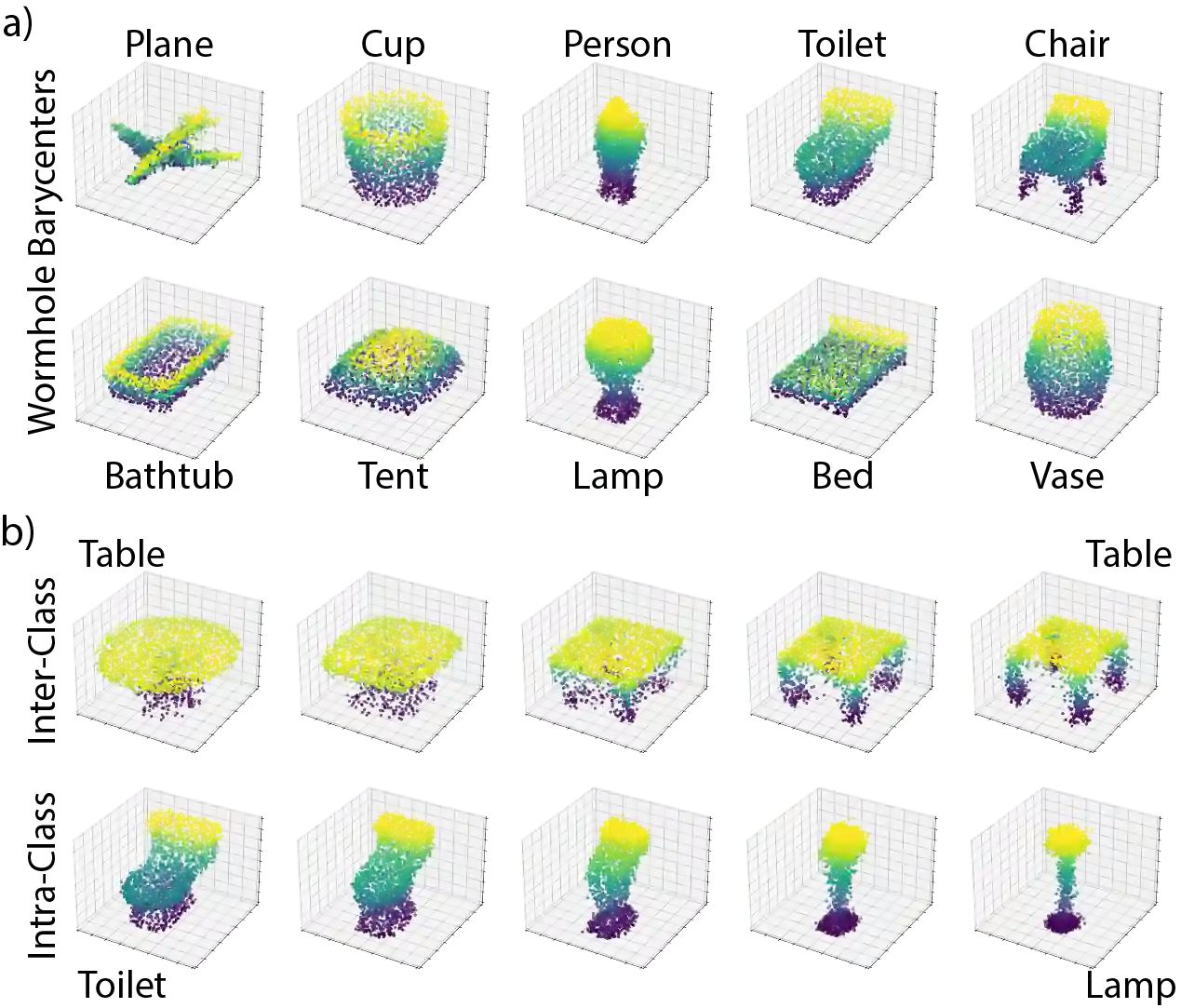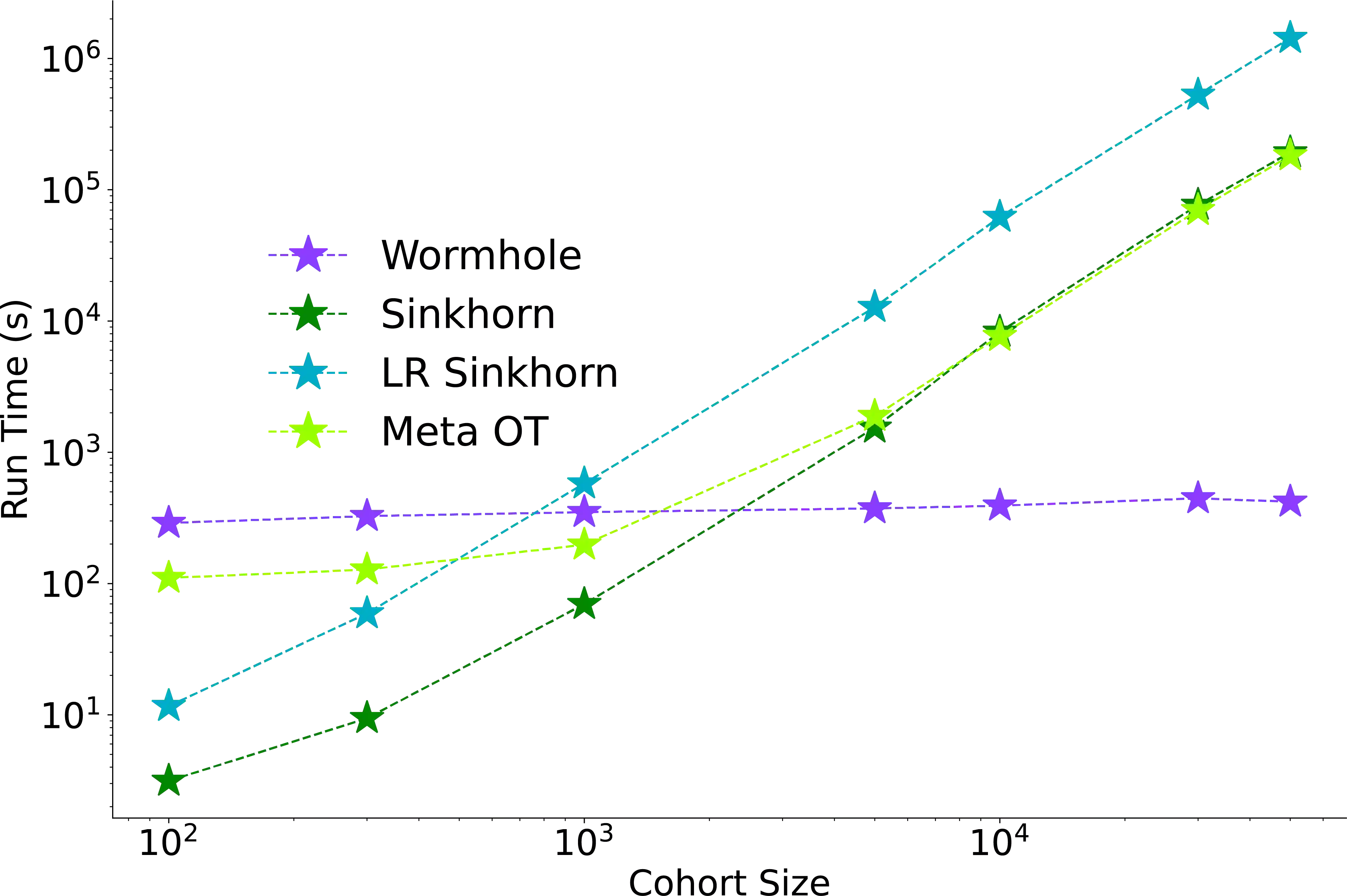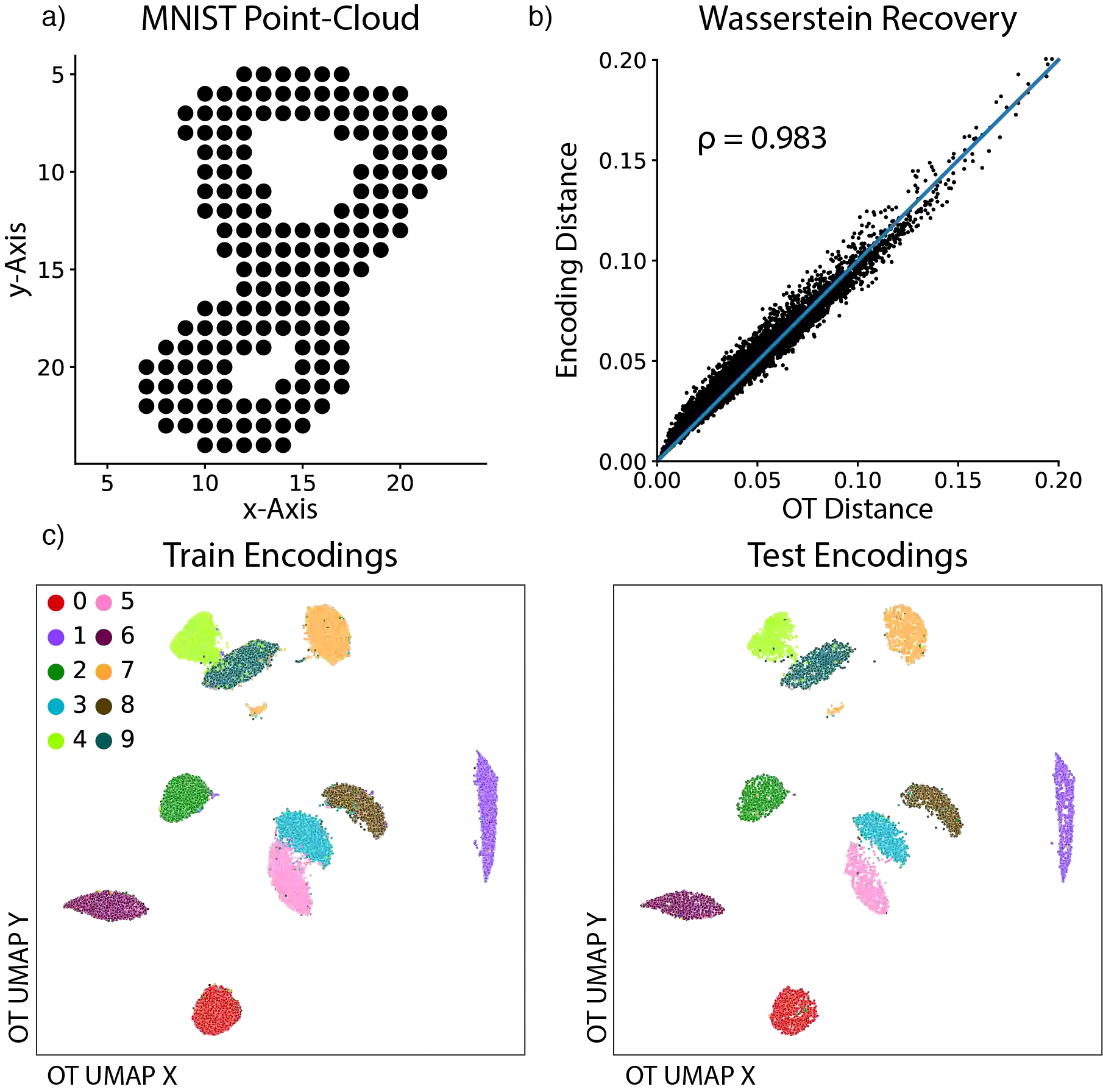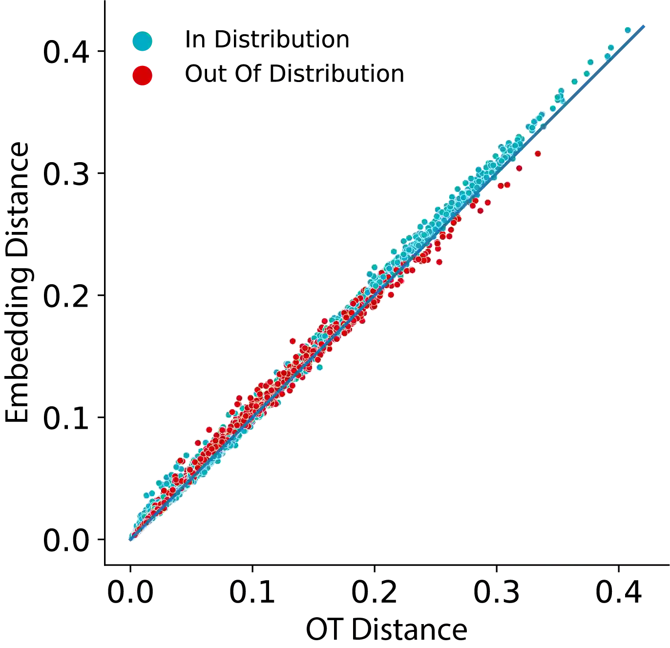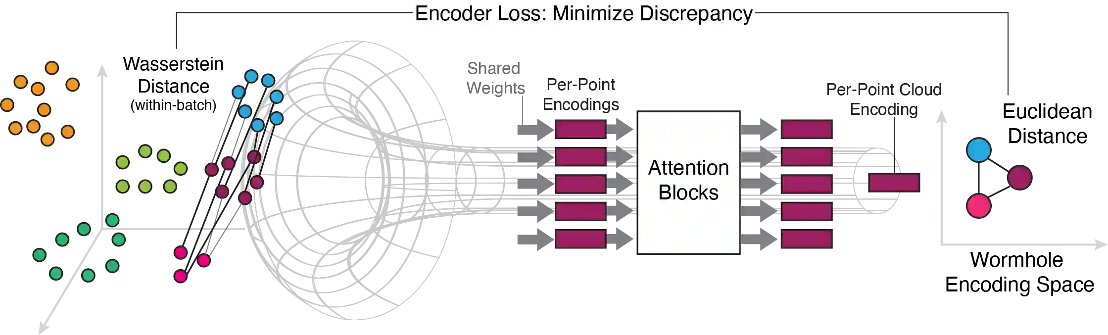 Optimal transport (OT) and the related Wasserstein metric (W) are powerful and ubiquitous tools for comparing distributions. However, computing pairwise Wasserstein distances rapidly becomes intractable as cohort size grows. An attractive alternative would be to find an embedding space in which pairwise Euclidean distances map to OT distances, akin to standard multidimensional scaling (MDS). We present Wasserstein Wormhole, a transformer-based autoencoder that embeds empirical distributions into a latent space wherein Euclidean distances approximate OT distances. Extending MDS theory, we show that our objective function implies a bound on the error incurred when embedding non-Euclidean distances. Empirically, distances between Wormhole embeddings closely match Wasserstein distances, enabling linear time computation of OT distances. Along with an encoder that maps distributions to embeddings, Wasserstein Wormhole includes a decoder that maps embeddings back to distributions, allowing for operations in the embedding space to generalize to OT spaces, such as Wasserstein barycenter estimation and OT interpolation. By lending scalability and interpretability to OT approaches, Wasserstein Wormhole unlocks new avenues for data analysis in the fields of computational geometry and single-cell biology.