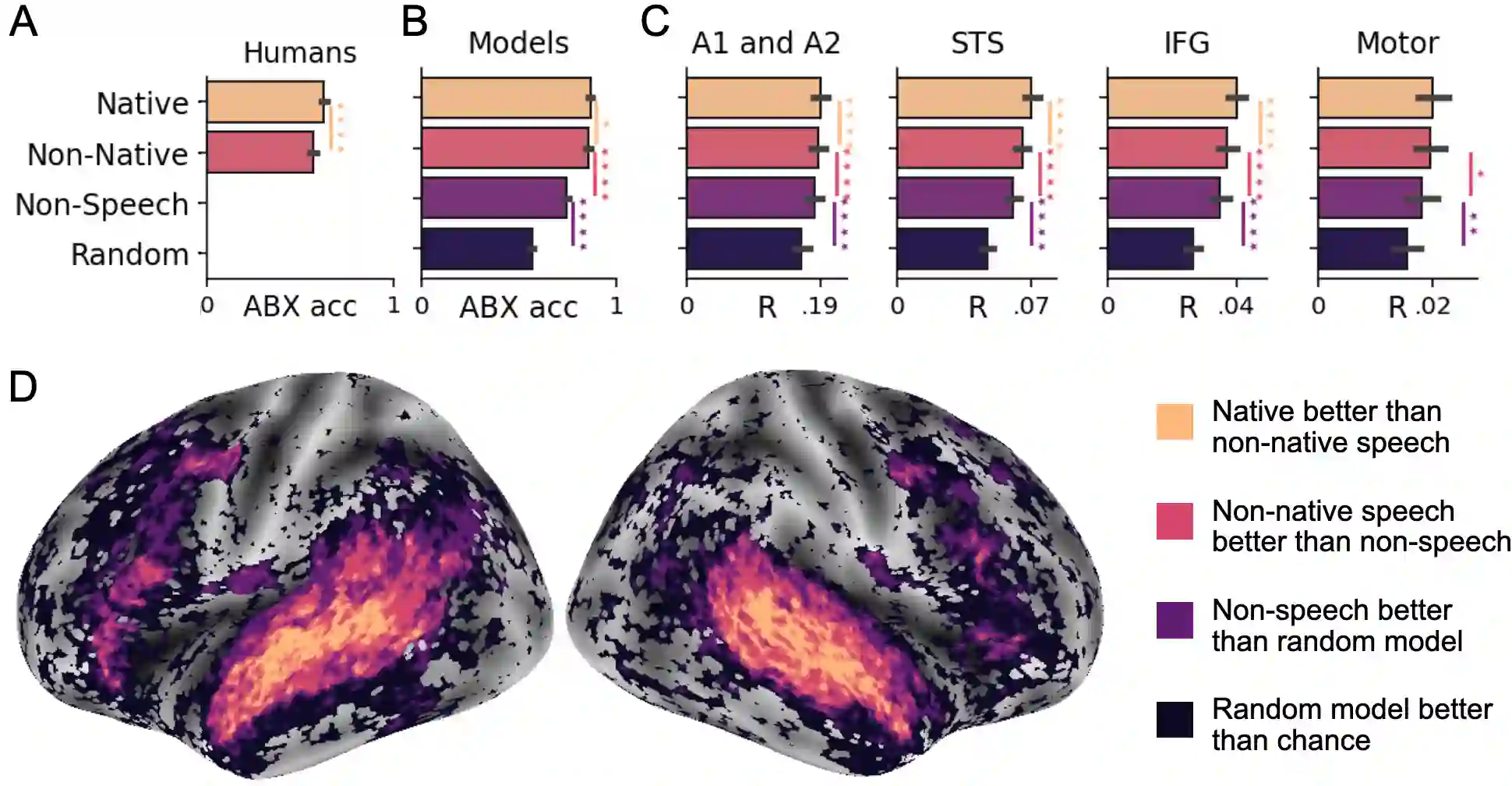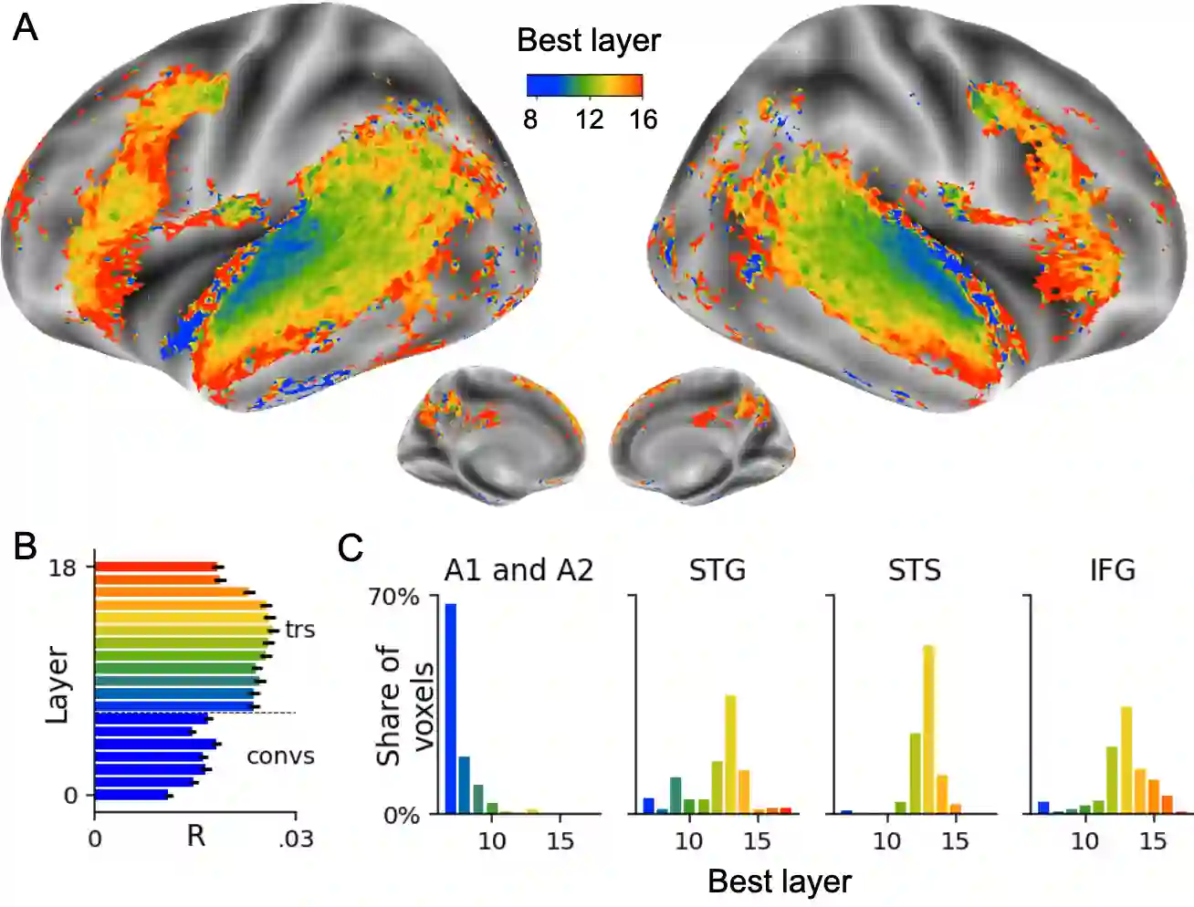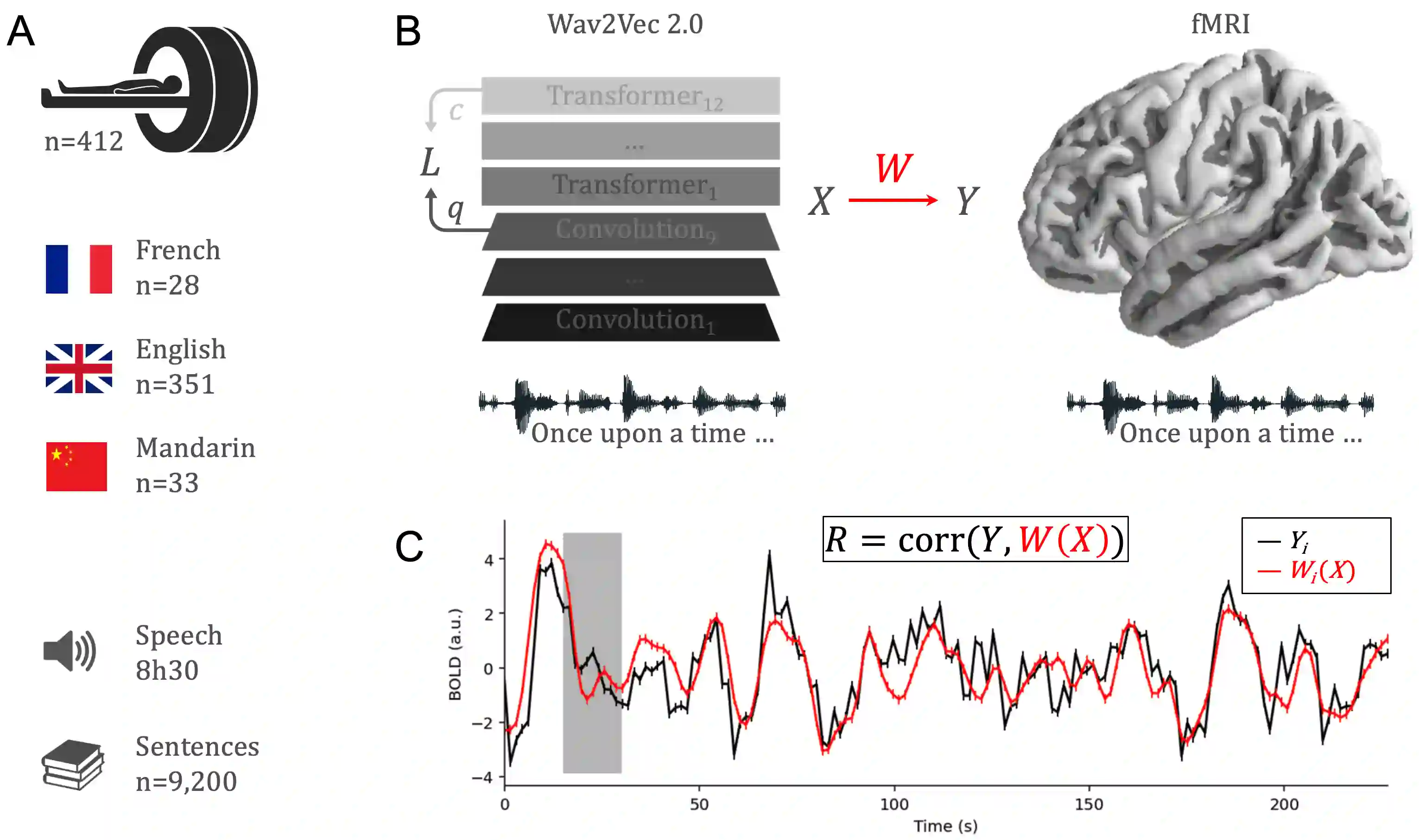 翻译:最近一些深心神经网络被显示产生类似于大脑的激活,以回应同样的输入。然而,这些算法在很大程度上仍然难以令人信服:它们需要 (1) 超乎寻常的大量数据, (2) 无法获取的监管标签, (3) 文本而非原始感官输入, 以及 / 或 (4) 令人难以置信的大记忆( 例如, 上千个背景字) 。 这些元素突出表明, 需要找出算法, 在这些限制下, 足以同时说明行为和大脑反应。 侧重于语言处理问题, 我们在这里假设, 在原始波形上训练的自我监督的算法构成一个充满希望的候选者。 具体而言, 我们比较了最近的自我监督结构结构, 2 文本, 而不是原始感官感知的感官输入, 312 个英语、 法语和曼达林的个人脑活动, 记录了磁力振荡感应前( fMRI), 同时他们听了 my1hh 语音书, 我们的成绩是4倍。 首先, 我们显示这个算法学会了大脑的表达方式, 其获取日期, 以近600小时的大脑表达方式, 直观, 直观的直观, 和直观的大脑表达式结构结构结构结构结构结构 。