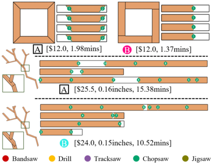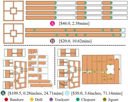 翻译:过去关于优化制造计划的工作,给木工设计提供木工设计,可以提供Pareto-最佳计划,在材料废物、制造时间、精度和其他考虑之间进行交换。然而,在制订制造计划时,专家很少局限于单一设计,而没有考虑到设计变异的类别,有时调整设计以简化制造。联合探索每个设计的设计与制造计划空间,使用当前技术很难解决。我们提出了一个新的方法,以共同优化木工物体的设计和制造计划。为了使这一双级优化可以推广,我们从基于平等图(e-graphs)的程式合成(e-graphs)(e-graphs)中调整最近的工作,该图将相同的程序编码。我们的见解是,我们双级问题中的子问题共占了重要的子结构。通过在新的部件(BOP)电子绘图包中代表设计和制造计划,我们把优化设计中多个候选人共享的设计组成部分的成本集中在一起。即使使用BOPe-graph,优化空间在实践中也迅速增长。因此,我们还展示了一种反馈指导的搜索策略,将电子合同和扩展电子地图上的扩展,我们通过直接的域搜索优势展示了我们的空间候选人。