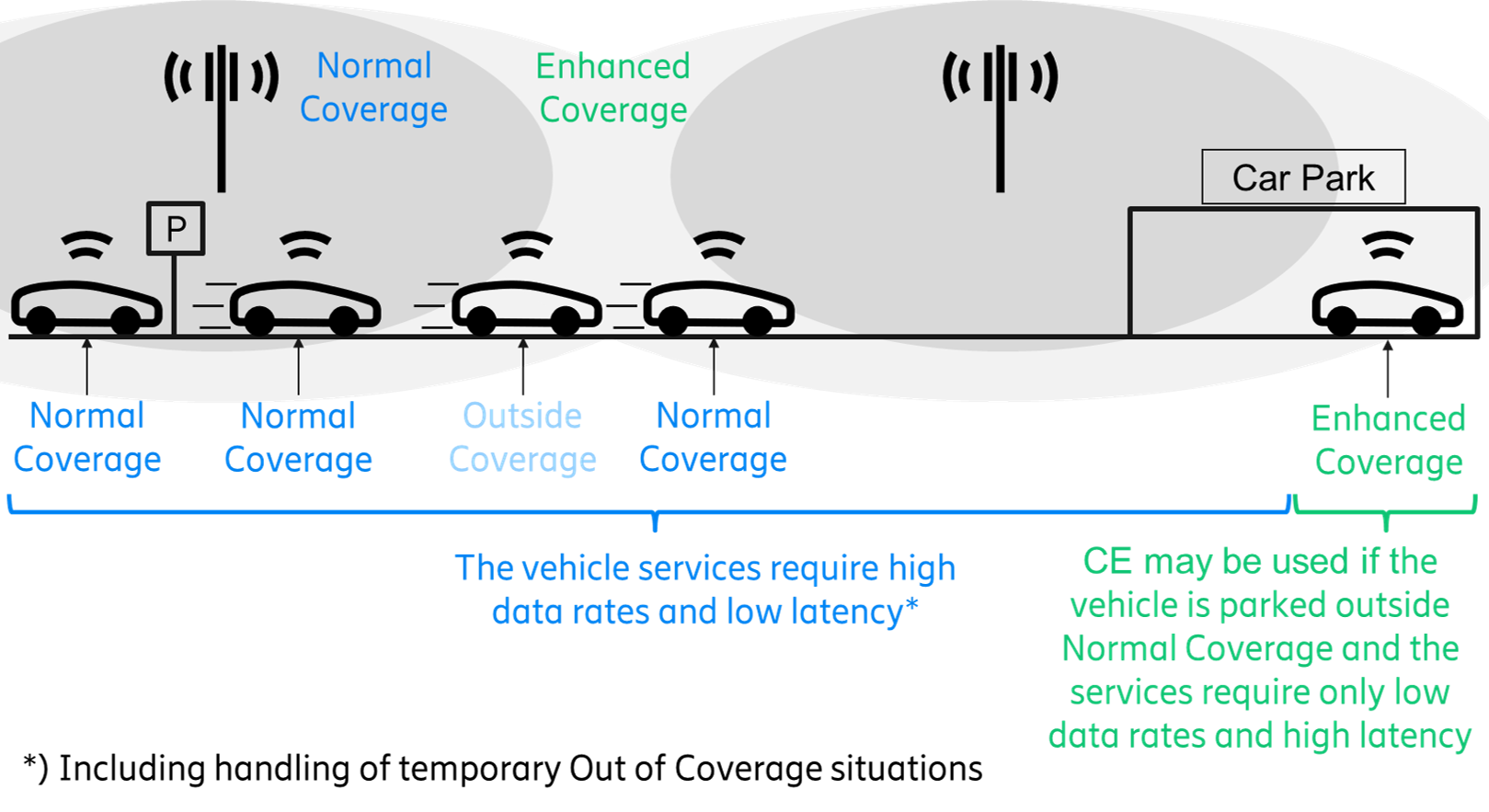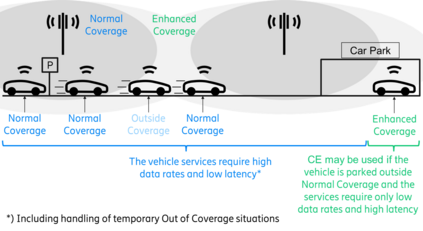 The Third Generation Partnership Project (3GPP) has standardized Coverage Enhancement (CE) for Internet-of-Things (IoT) to connect devices in challenging radio conditions with cellular networks. CE is based on the principle of prolonged transmission time that exploits the fact that many IoT applications have relaxed requirements on data rate and latency, and the coverage can be significantly boosted by repeating transmissions for such applications. However, CE consumes a lot of radio resources and should be implemented carefully for different applications. This paper presents an end-to-end concept for realizing dynamic use of CE for connected vehicles in a resource efficient way. The proposed framework has the potential of improving coverage by around 10dB for low data rate connected vehicle applications, based on the 3GPP Long Term Evolution (LTE) standard.