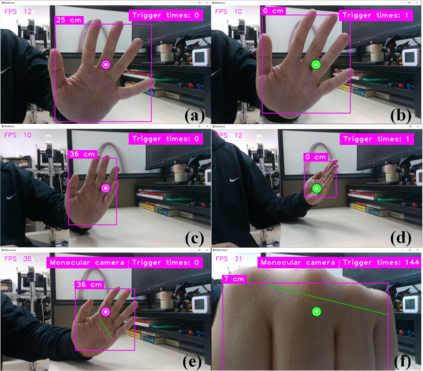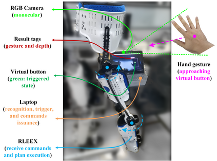 With the rapid development of Rehabilitation Lower Extremity Robotic Exoskeletons (RLEEX) technology, significant advancements have been made in Human-Robot Interaction (HRI) methods. These include traditional physical HRI methods that are easily recognizable and various bio-electrical signal-based HRI methods that can visualize and predict actions. However, most of these HRI methods are contact-based, facing challenges such as operational complexity, sensitivity to interference, risks associated with implantable devices, and, most importantly, limitations in comfort. These challenges render the interaction less intuitive and natural, which can negatively impact patient motivation for rehabilitation. To address these issues, this paper proposes a novel non-contact gesture interaction control method for RLEEX, based on RGB monocular camera depth estimation. This method integrates three key steps: detecting keypoints, recognizing gestures, and assessing distance, thereby applying gesture information and augmented reality triggering technology to control gait movements of RLEEX. Results indicate that this approach provides a feasible solution to the problems of poor comfort, low reliability, and high latency in HRI for RLEEX platforms. Specifically, it achieves a gesture-controlled exoskeleton motion accuracy of 94.11\% and an average system response time of 0.615 seconds through non-contact HRI. The proposed non-contact HRI method represents a pioneering advancement in control interactions for RLEEX, paving the way for further exploration and development in this field.