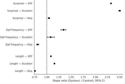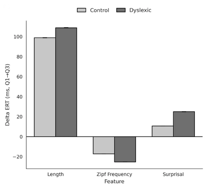 We ask where, and under what conditions, dyslexic reading costs arise in a large-scale naturalistic reading dataset. Using eye-tracking aligned to word-level features (word length, frequency, and predictability), we model how each feature influences dyslexic time costs. We find that all three features robustly change reading times in both typical and dyslexic readers, and that dyslexic readers show stronger sensitivities to each, especially predictability. Counterfactual manipulations of these features substantially narrow the dyslexic-control gap by about one third, with predictability showing the strongest effect, followed by length and frequency. These patterns align with dyslexia theories that posit heightened demands on linguistic working memory and phonological encoding, and they motivate further work on lexical complexity and parafoveal preview benefits to explain the remaining gap. In short, we quantify when extra dyslexic costs arise, how large they are, and offer actionable guidance for interventions and computational models for dyslexics.