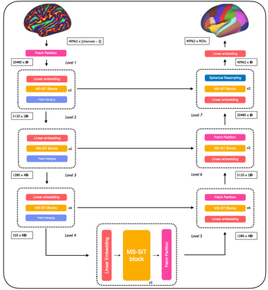 翻译:表面网格是表示人类皮层结构和功能信息的优选领域,但其复杂的拓扑和几何形状对深度学习分析提出了重大挑战。虽然变形器在序列到序列学习方面表现出色,尤其是对于其中卷积操作的平移非平凡时,但自我注意操作的二次成本仍然是许多密集预测任务的障碍。受最新的多尺度模型化,带有视觉变换器的启发,我们引入了多尺度表面视觉变换器(MS-SiT)作为表面深度学习的骨干架构。自我注意机制应用于局部网格窗口中,以允许对底层数据进行高分辨率采样,而移位窗口策略则提高了窗口之间信息共享的效果。相邻的补丁被逐层合并,使得MS-SiT能够学习可适用于任何预测任务的分层表示。结果表明,使用发展中人类连接组学(dHCP)数据集对新生儿表型预测任务进行评估时,MS-SiT的表现优于现有的表面深度学习方法。此外,将MS-SiT骨干架构嵌入到用于表面分割的U型架构中,在UK Biobank (UKB)和手工注释的MindBoggle数据集上展现了竞争性的结果。代码和训练模型公开在 https://github.com/metrics-lab/surface-vision-transformers。