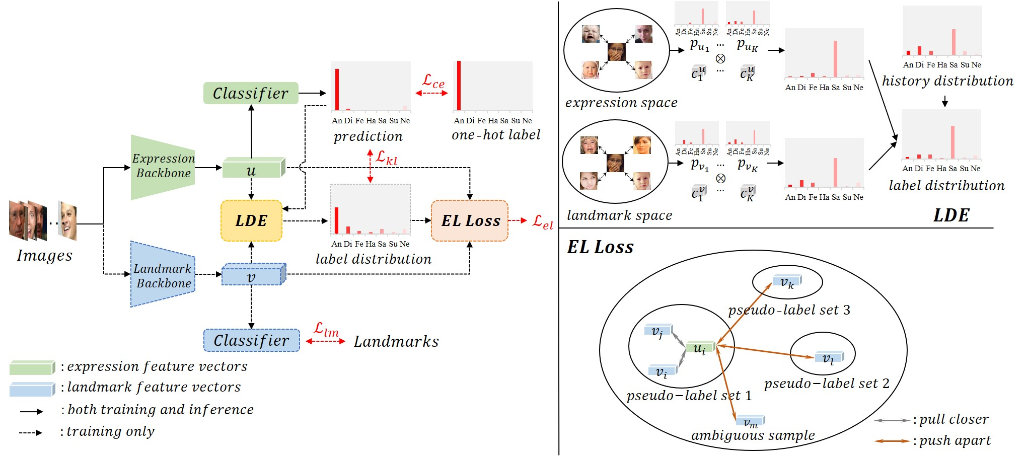 Facial expression recognition (FER) remains a challenging task due to the ambiguity of expressions. The derived noisy labels significantly harm the performance in real-world scenarios. To address this issue, we present a new FER model named Landmark-Aware Net~(LA-Net), which leverages facial landmarks to mitigate the impact of label noise from two perspectives. Firstly, LA-Net uses landmark information to suppress the uncertainty in expression space and constructs the label distribution of each sample by neighborhood aggregation, which in turn improves the quality of training supervision. Secondly, the model incorporates landmark information into expression representations using the devised expression-landmark contrastive loss. The enhanced expression feature extractor can be less susceptible to label noise. Our method can be integrated with any deep neural network for better training supervision without introducing extra inference costs. We conduct extensive experiments on both in-the-wild datasets and synthetic noisy datasets and demonstrate that LA-Net achieves state-of-the-art performance.