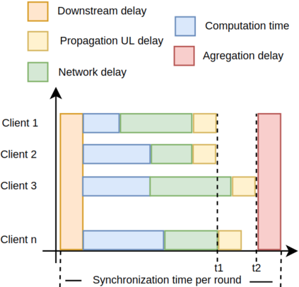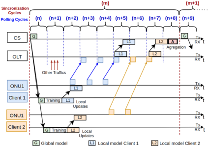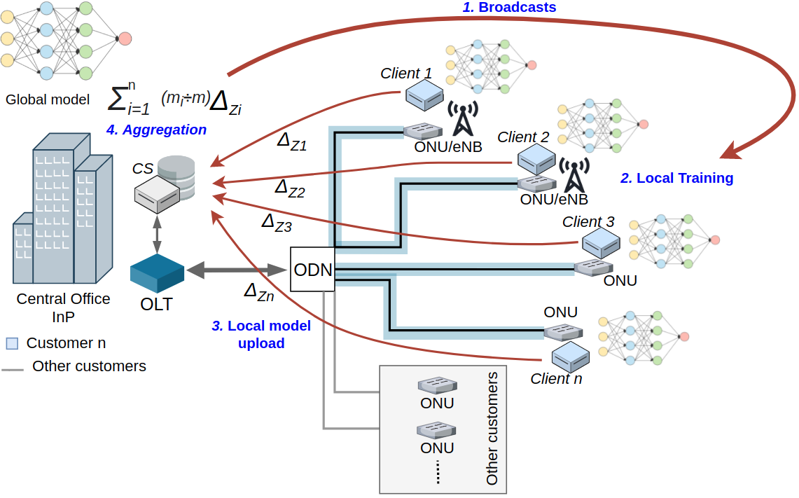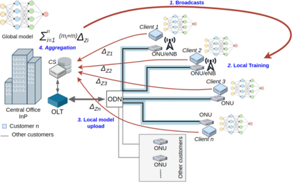 翻译:联邦学习(FL)是一种分布式机器学习(ML)处理方式,它保护用户数据的隐私,只与共用服务器共享ML模型的参数;FL的处理需要通信网络运作需要满足的具体的延时和带宽要求;本文介绍了用于服务质量的动态波长和带宽分配算法(Qos),为FL传输量超过50Gb/s Ethernet被动光学网络提供50Gb/s Ethernet被动光学网络;拟议的算法优先考虑FL通信量,减少FL的延迟,减少在同一基础设施支持的延迟关键应用。