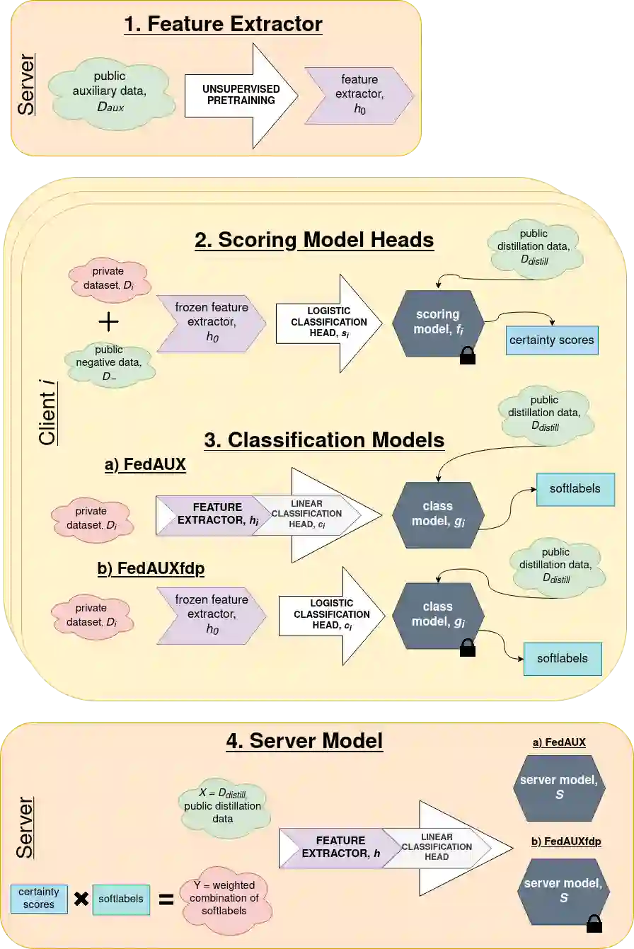 翻译:在非本地数据集中,即客户数据分布不一时,联邦学习会受到影响。应对这一挑战的一个有希望的方法是最近提出的FedAUX方法,即增加联合蒸馏,对即使是高度多样化的客户数据也产生强有力的结果。FedAUX是一种部分(//epsilon,\delta)美元-有区别的私人方法,因为客户的私人数据仅在其参与的培训中的一部分得到保护。这项工作有助于完全差别化的私人修改,称为FedAUXfdp。我们进一步贡献了正规化多金属物流回归对美元-2美元敏感度的上限。在与大型图像数据集深度网络的实验中,具有强烈差异隐私权保障的FedAUXfdp在仅仅一次通信回合中比其他同样私有化的SOTA非客户数据基线要好得多。修改方法的全面私有化导致所有级别数据的高度遗传性降低。