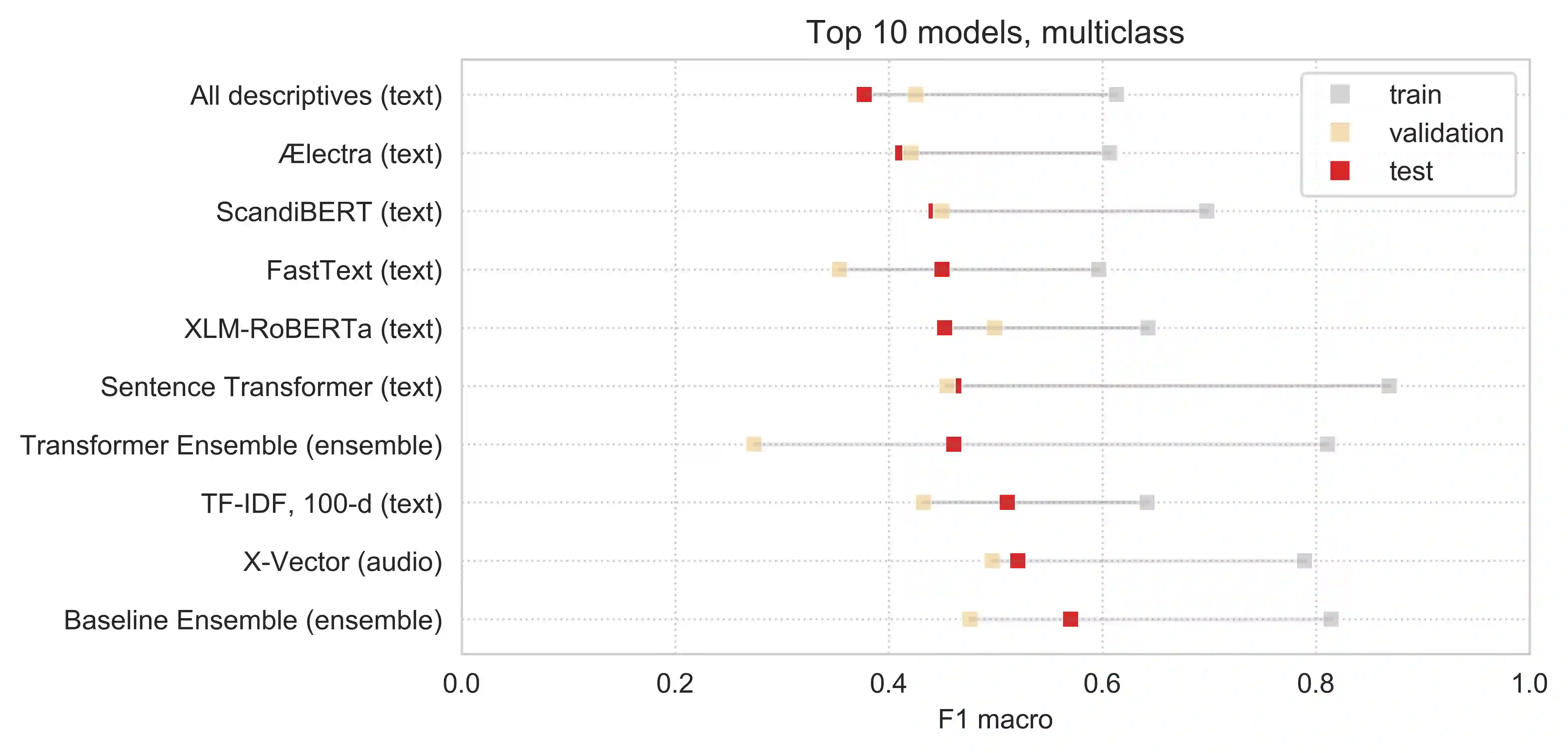翻译:然而,大多数研究只是将单一临床组与健康控制进行比较,而临床实践往往需要区分多种潜在诊断(多级设置),为此,我们从420名参与者(67名患有严重抑郁症者,106名患有精神分裂症者,46名患有自闭症者,以及相应的控制)收集了一组重复记录的数据集。 当对多个诊断组的性能进行明显下降时,根据声音和文字特征,测试了一系列常规机器学习模型和先进的二进制和多级变异模型在二进制和多级分类方面的性能。虽然二进制模型与以往的研究比较(自闭症谱系特征的F1分在0.54-0.75之间,ASD;主要抑郁症、MDDD和0.77-0.92之间;精神分裂症的0.71-0.83之间;当多种诊断组的性能差异明显下降(ASDASSD在0.35-0.44之间,0.57-075至0.75之间,MDDD,0.76至0.66之间,精神分裂型模型与0.38-052 宏观F1之间), 将语音诊断特征分分分分分分分数; 将语音诊断模型结合分析模型,用于测量分析分析,以分析分析分析,以分析为基础分析为基础分析,以分析为基础分析为基础分析为基础分析,以分析为基础分析基础分析基础分析基础分析基础分析,以分析为基础分析,以分析为基础,以分析基础,以分析为基础,以分析结果分析,以分析,以分析基础分析为基础分析为基础,以分析为基础的模型为基础的模型为基础的模型为基础的模型,以分析为基础的模型为基础的模型为基础的模型为基础的模型为基础的模型为基础,用于为基础的模型,以分析,以分析,以分析,以分析,以分析,以分析,以分析基础,以分析为基础,以分析为基础,以分析基础,以分析基础,以分析基础,以分析基础,以分析基础分析基础分析基础分析基础,以分析基础分析为基础分析为基础,以分析基础的模型为基础,以分析为基础分析为基础分析为基础分析基础分析为基础分析为基础分析基础分析为基础分析为基础分析为基础分析为基础分析为基础的模型,