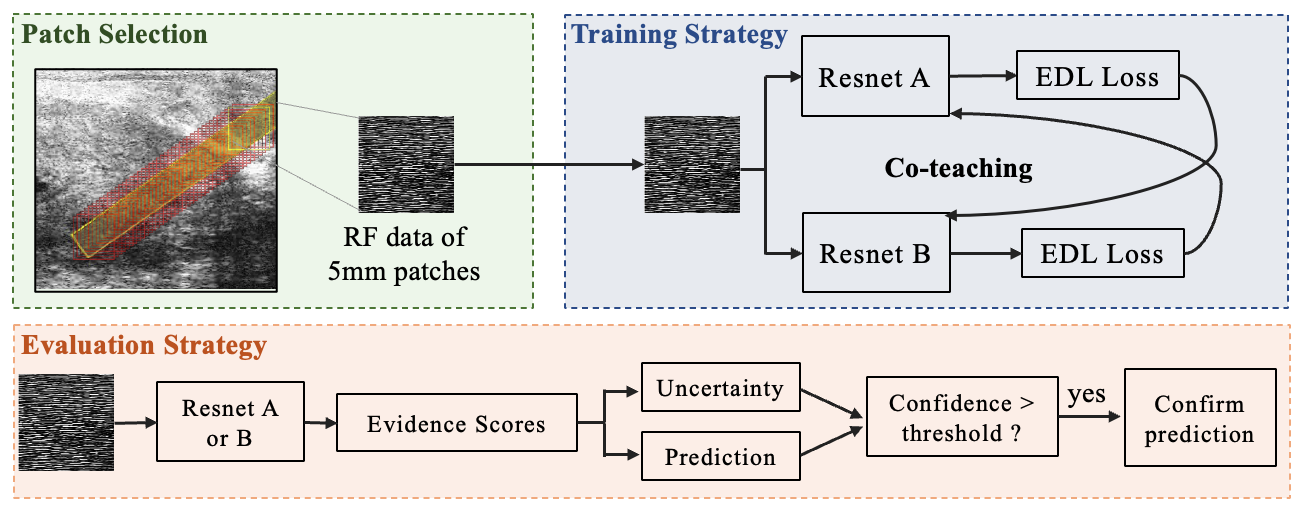 翻译:MOTIVATION:在跨红外超声道导导导生物检查期间检测前列腺癌是一个挑战性的挑战。癌症的外观、超声道手工艺的存在以及噪音的出现等差异性都造成了这些困难。高频超声成像(微超声波)最近的进展大大提高了组织成像的高分辨率能力。我们的目标是调查专门为微超声导导前列列腺癌生物检查开发一个强大的深层次学习模型的情况。要临床采用模型,关键的挑战是如何设计一种解决方案,既能自信地识别癌症,又能从引入薄弱标签的生物心理学样本的粗皮细胞病理学测量中学习。方法:我们使用从194个接受过前列腺生物检查的病人那里获得的微声成像数据集,大大提高了组织生物测定结果的不确定性。我们用共同教学模型来培养深度模型来处理标签中的噪音,同时使用明显的深层次的学习方法来估计不确定性。我们用与临床相关的精确度比信任度来评估模型的绩效。 RETESS-AREDS:我们模型在显著的不确定性估算领域实现了一个清晰的精确度估算。
