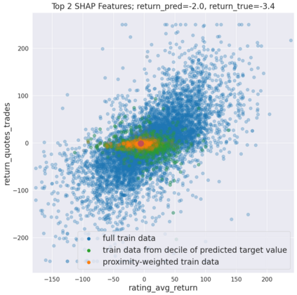 We initiate a novel approach to explain the predictions and out of sample performance of random forest (RF) regression and classification models by exploiting the fact that any RF can be mathematically formulated as an adaptive weighted K nearest-neighbors model. Specifically, we employ a recent result that, for both regression and classification tasks, any RF prediction can be rewritten exactly as a weighted sum of the training targets, where the weights are RF proximities between the corresponding pairs of data points. We show that this linearity facilitates a local notion of explainability of RF predictions that generates attributions for any model prediction across observations in the training set, and thereby complements established feature-based methods like SHAP, which generate attributions for a model prediction across input features. We show how this proximity-based approach to explainability can be used in conjunction with SHAP to explain not just the model predictions, but also out-of-sample performance, in the sense that proximities furnish a novel means of assessing when a given model prediction is more or less likely to be correct. We demonstrate this approach in the modeling of US corporate bond prices and returns in both regression and classification cases.