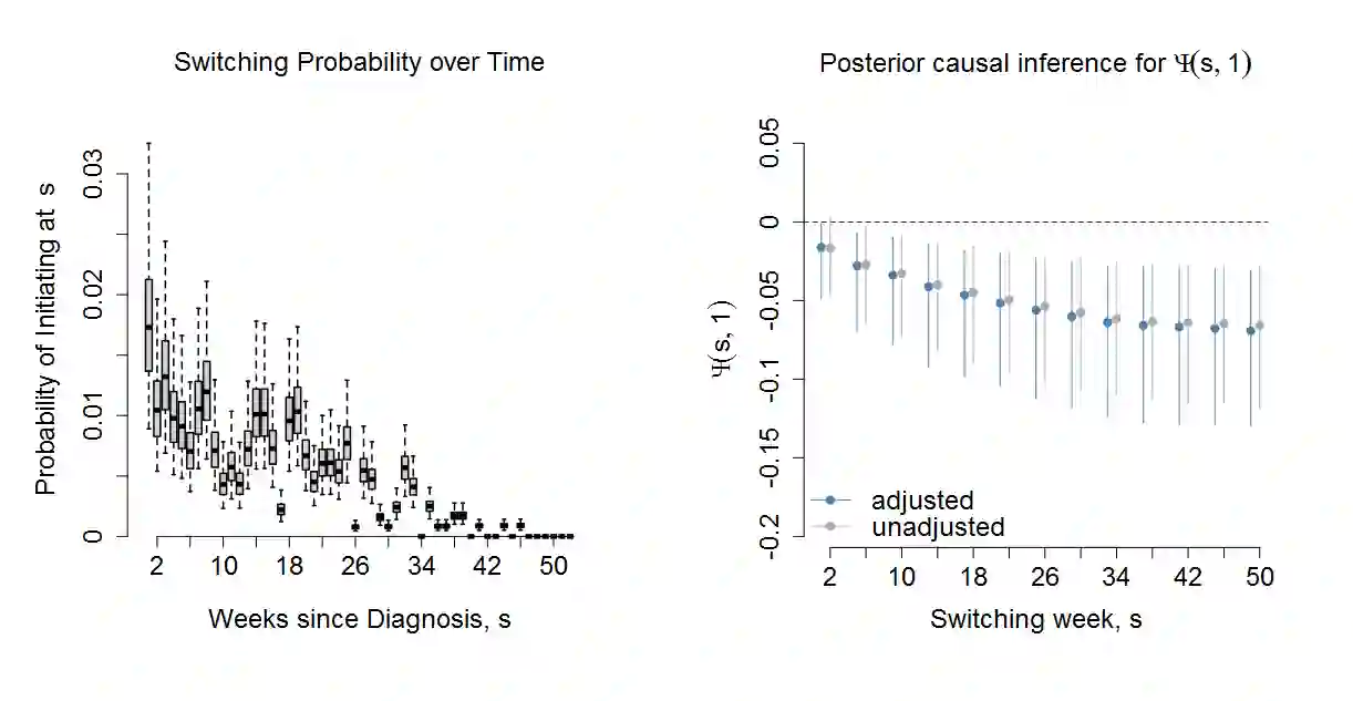 翻译:在生物医学统计中,对复发事件的观察性研究很常见。总体上,目的是在指定的随访时间内估计目标人群中两种治疗方法的事件率差异。使用观察性索赔数据进行估计是具有挑战性的,因为虽然目标人群的成员资格是以资格标准为基础定义的,但治疗很少会在资格的确切时间被准确分配。此时,应对不当的时间对齐进行处理,例如根据后续分配在资格时间点上分配治疗,错误地将先前的事件率归因于治疗 - 这将导致不朽风险偏倚。即使资格和治疗是一致的,末端事件进程(例如死亡)常常会停止我们感兴趣的复发事件进程。这两个过程也因未观察到在整个随访时间内的事件而被截断。我们的方法通过将其视为治疗转换问题来解决时间对齐问题。有些患者在资格时接受治疗,而其他人则没有接受治疗,但在特定时间可能会转换到治疗 - 如果他们存活时间足够长的话。在指定因果假设下,我们定义并确定了开关的平均因果效应。利用联合半参数贝叶斯模型对死亡和复发事件进程进行估计。通过对各种开关时间的估量来计算估计量,以评估治疗时机的影响。我们使用医疗保险索赔数据将该方法应用于比较治疗慢性腰痛患者的不同阿片类药物策略下的住院率。